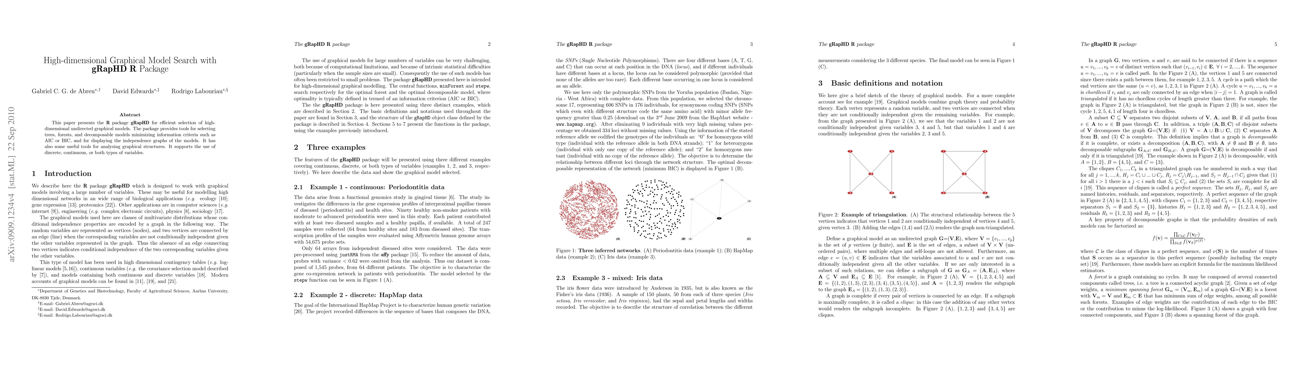 This paper introduces the gRapHD R package for selecting high-dimensional undirected graphical models, offering tools to minimize criteria like AIC or BIC and display independence graphs. It supports mixed variable types and analyzes graphical structures efficiently.