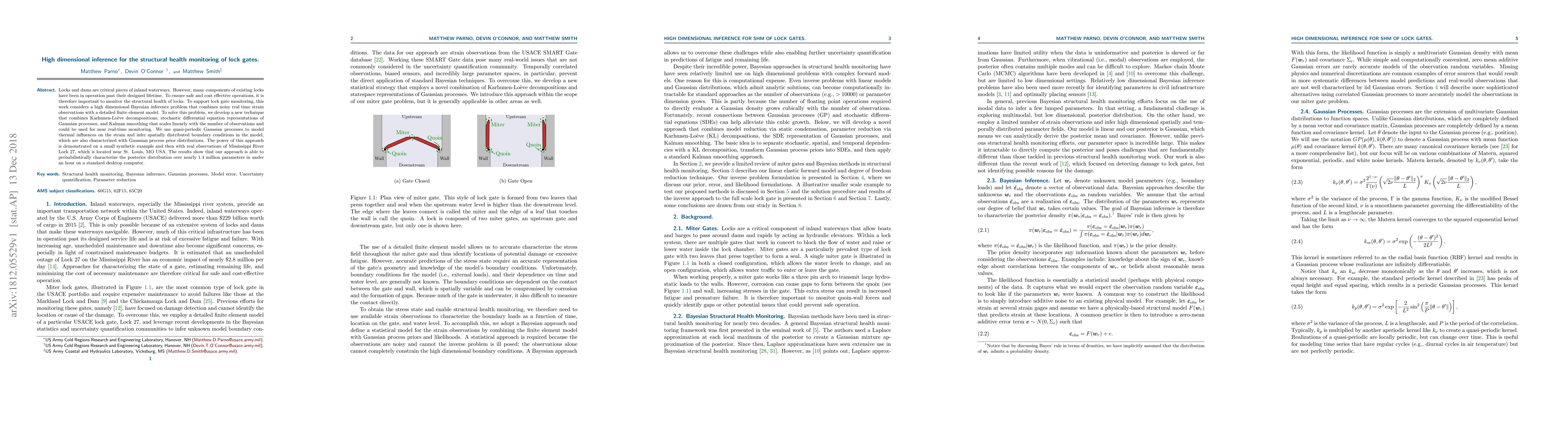 This research introduces a method using high dimensional Bayesian inference to monitor the structural health of lock gates, combining real-time strain observations with detailed finite element models. The novel technique scales linearly with observations, enabling near real-time monitoring. It's demonstrated to efficiently characterize posterior distributions over millions of parameters using Gaussian processes for thermal influences and boundary conditions modeling.