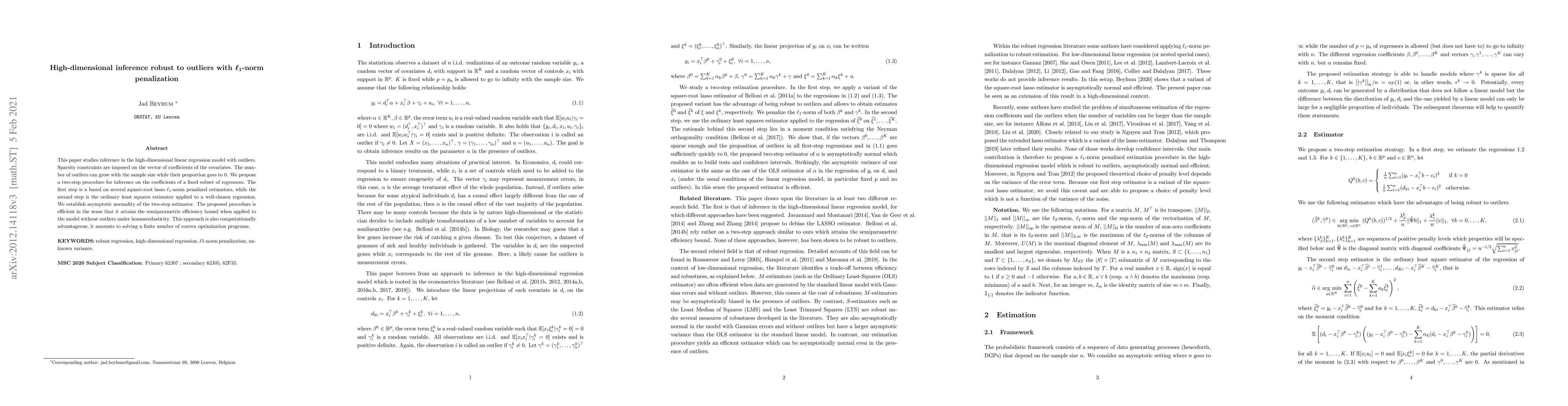 This paper proposes a two-step procedure for robust high-dimensional inference in linear regression with outliers, using square-root lasso l1-norm penalization followed by ordinary least squares. It achieves asymptotic normality and semiparametric efficiency under homoscedasticity.