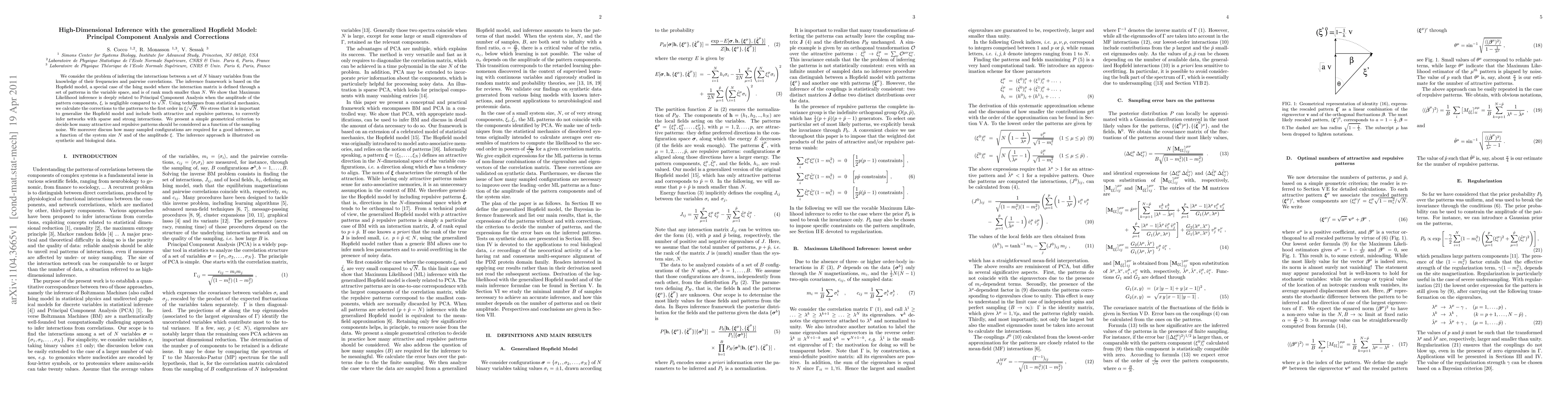 We consider the problem of inferring the interactions between a set of N binary variables from the knowledge of their frequencies and pairwise correlations. The inference framework is based on the Hopfield model, a special case of the Ising model where the interaction matrix is defined through a set of patterns in the variable space, and is of rank much smaller than N. We show that Maximum Lik elihood inference is deeply related to Principal Component Analysis when the amp litude of the pattern components, xi, is negligible compared to N^1/2. Using techniques from statistical mechanics, we calculate the corrections to the patterns to the first order in xi/N^1/2. We stress that it is important to generalize the Hopfield model and include both attractive and repulsive patterns, to correctly infer networks with sparse and strong interactions. We present a simple geometrical criterion to decide how many attractive and repulsive patterns should be considered as a function of the sampling noise. We moreover discuss how many sampled configurations are required for a good inference, as a function of the system size, N and of the amplitude, xi. The inference approach is illustrated on synthetic and biological data.