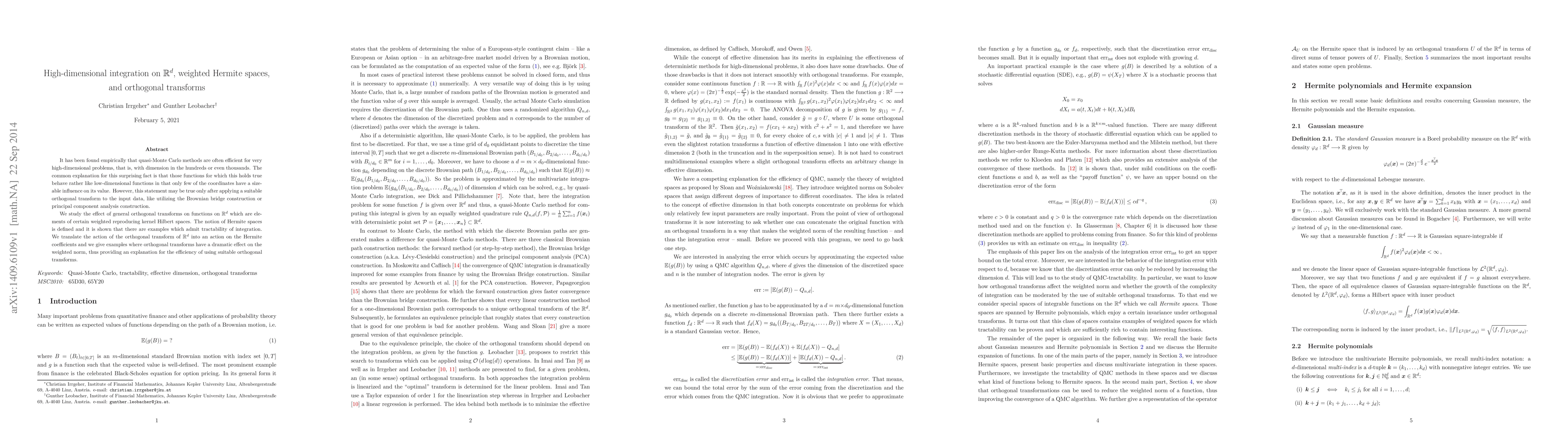 This paper investigates the efficiency of quasi-Monte Carlo methods for high-dimensional integration, attributing their success to the behavior of functions under orthogonal transforms. It defines Hermite spaces and demonstrates how orthogonal transforms can significantly alter the weighted norm, thus explaining the improved performance of these transforms.