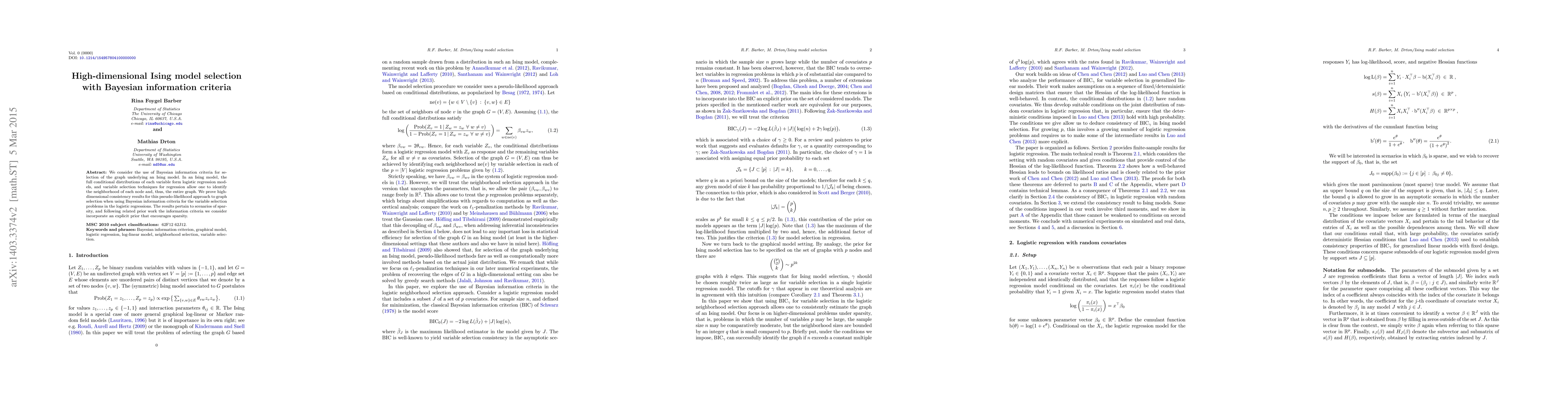 This paper explores the use of Bayesian information criteria for selecting the graph structure in high-dimensional Ising models, proving consistency in sparse scenarios. It leverages pseudo-likelihood approaches and logistic regression for variable selection, incorporating sparsity-encouraging priors.