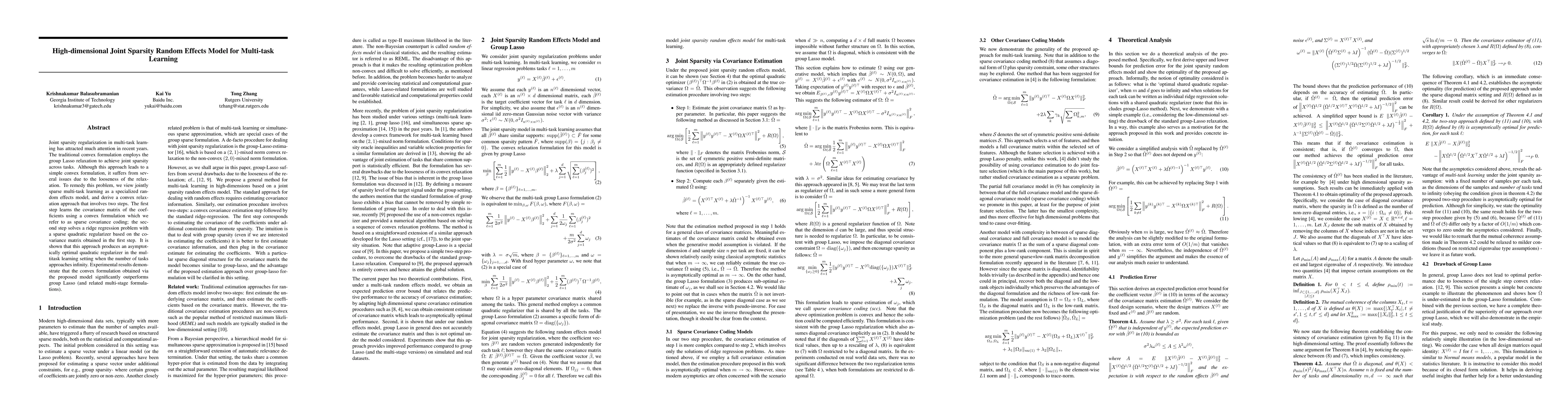 Joint sparsity regularization in multi-task learning has attracted much attention in recent years. The traditional convex formulation employs the group Lasso relaxation to achieve joint sparsity across tasks. Although this approach leads to a simple convex formulation, it suffers from several issues due to the looseness of the relaxation. To remedy this problem, we view jointly sparse multi-task learning as a specialized random effects model, and derive a convex relaxation approach that involves two steps. The first step learns the covariance matrix of the coefficients using a convex formulation which we refer to as sparse covariance coding; the second step solves a ridge regression problem with a sparse quadratic regularizer based on the covariance matrix obtained in the first step. It is shown that this approach produces an asymptotically optimal quadratic regularizer in the multitask learning setting when the number of tasks approaches infinity. Experimental results demonstrate that the convex formulation obtained via the proposed model significantly outperforms group Lasso (and related multi-stage formulations