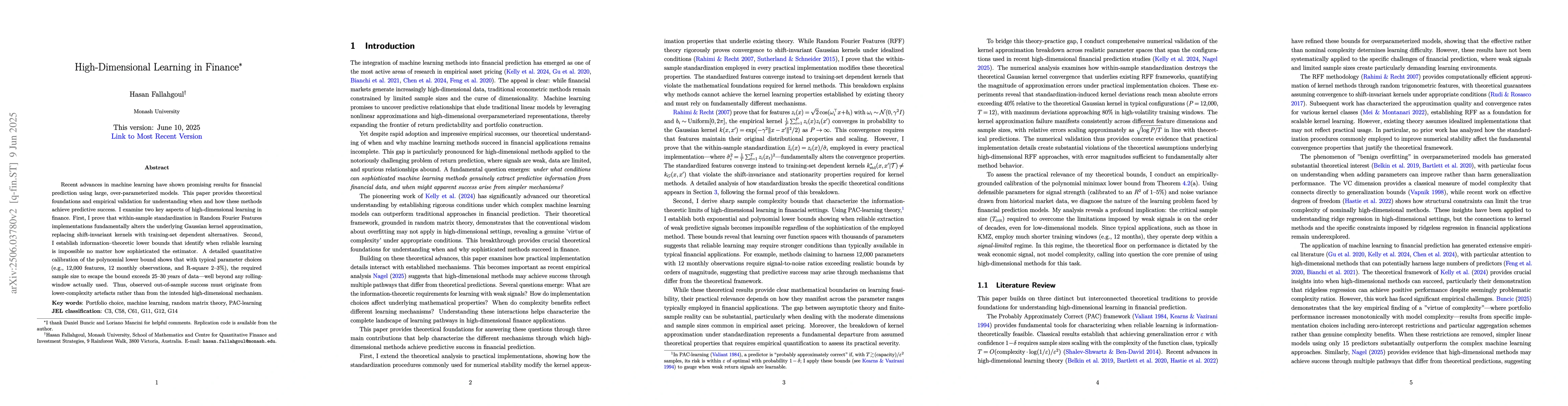 The research provides theoretical foundations and empirical validation for high-dimensional learning in finance using large, over-parameterized models. It examines three key aspects: the impact of within-sample standardization in Random Fourier Features, derives sample complexity bounds, and analyzes the VC-dimension of ridgeless regression.