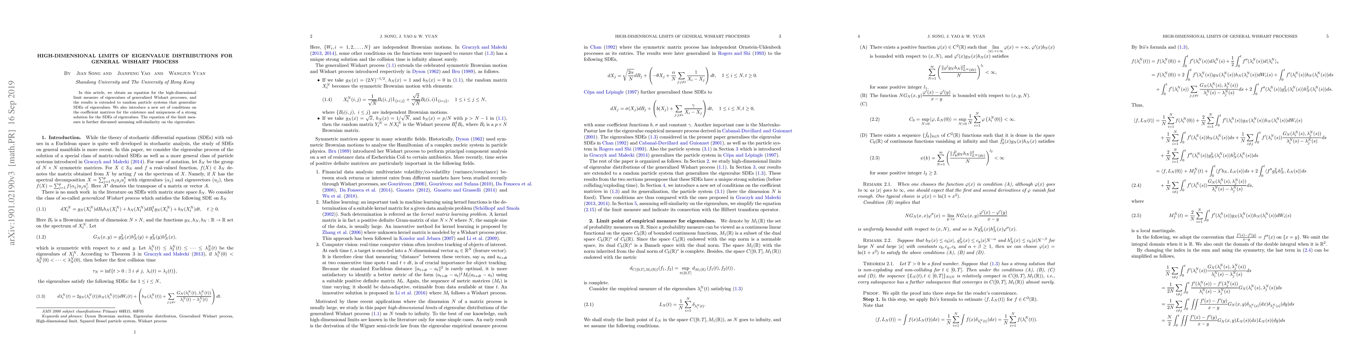 This paper derives the high-dimensional limit measure for eigenvalues of generalized Wishart processes and extends the results to random particle systems. It also establishes new conditions for the existence and uniqueness of solutions for the corresponding SDEs of eigenvalues, assuming self-similarity.