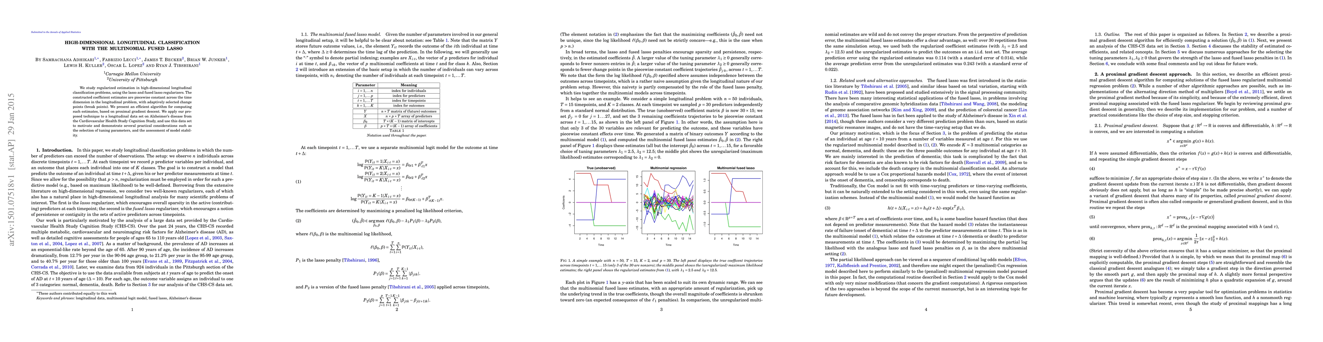 This paper proposes a method for high-dimensional longitudinal classification using the Multinomial Fused Lasso, which estimates piecewise constant coefficients with adaptively selected change points. An efficient algorithm based on proximal gradient descent is developed and applied to Alzheimer's disease data to demonstrate practical considerations like tuning parameter selection and model stability.