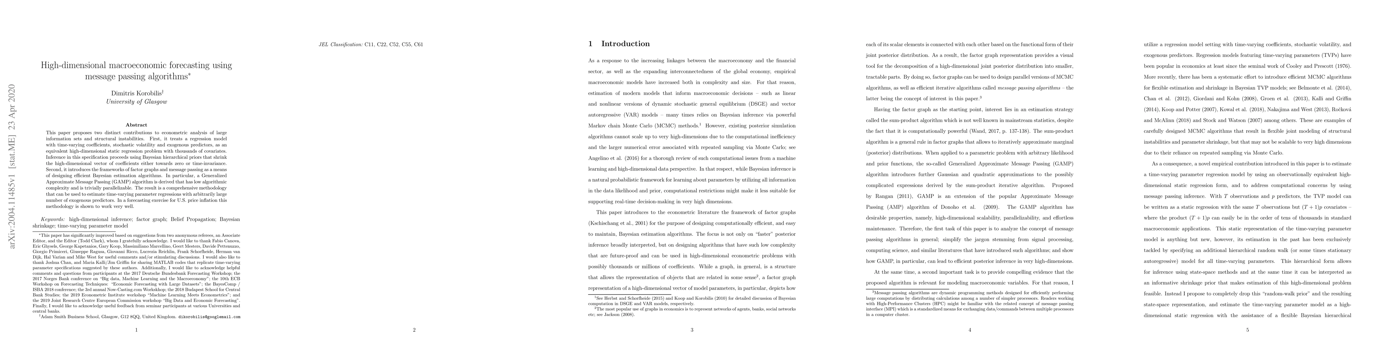 This paper proposes two distinct contributions to econometric analysis of large information sets and structural instabilities. First, it treats a regression model with time-varying coefficients, stochastic volatility and exogenous predictors, as an equivalent high-dimensional static regression problem with thousands of covariates. Inference in this specification proceeds using Bayesian hierarchical priors that shrink the high-dimensional vector of coefficients either towards zero or time-invariance. Second, it introduces the frameworks of factor graphs and message passing as a means of designing efficient Bayesian estimation algorithms. In particular, a Generalized Approximate Message Passing (GAMP) algorithm is derived that has low algorithmic complexity and is trivially parallelizable. The result is a comprehensive methodology that can be used to estimate time-varying parameter regressions with arbitrarily large number of exogenous predictors. In a forecasting exercise for U.S. price inflation this methodology is shown to work very well.