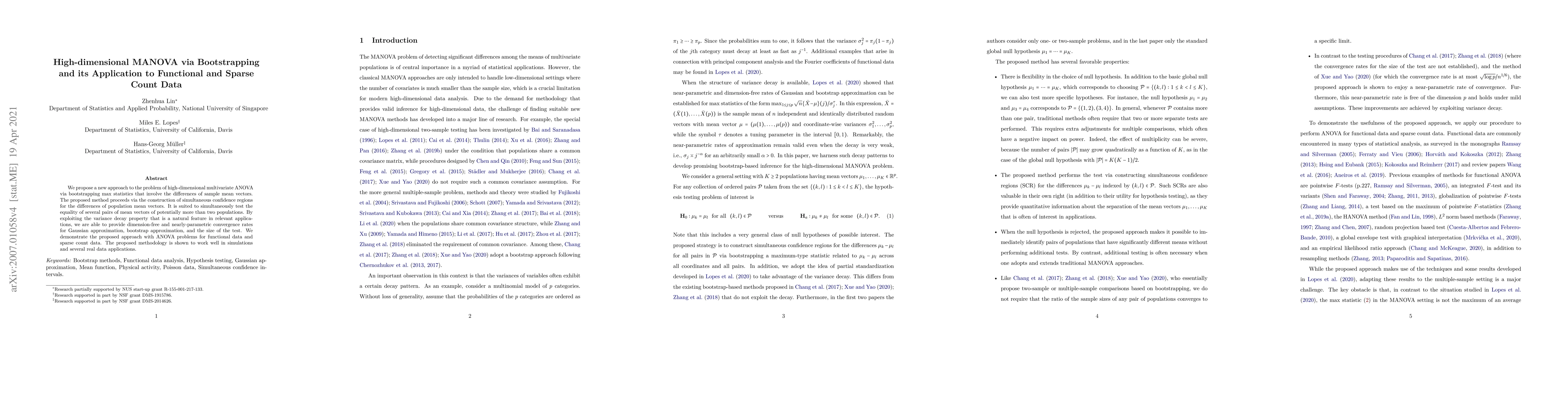 This paper proposes a new method for high-dimensional multivariate ANOVA that uses bootstrapping to test the equality of multiple population mean vectors. It provides dimension-free convergence rates and demonstrates its effectiveness in simulations and real data applications.