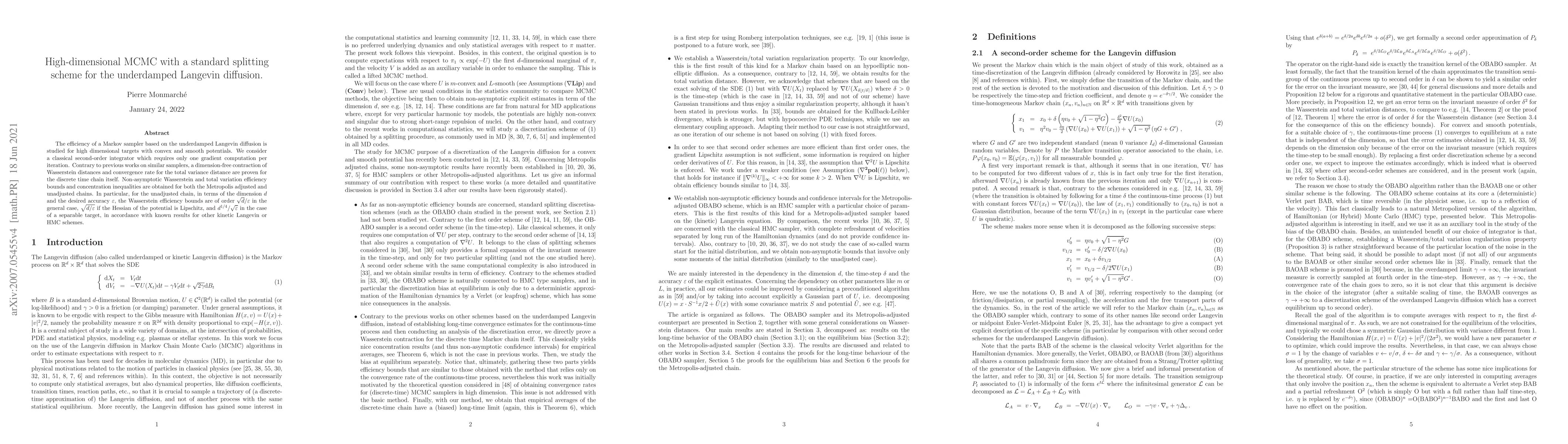 This research paper studies the efficiency of a Markov sampler based on underdamped Langevin diffusion for high-dimensional targets with convex and smooth potentials. It proves contraction of Wasserstein distances and convergence rates for the chain itself and provides non-asymptotic bounds for efficiency and concentration inequalities.