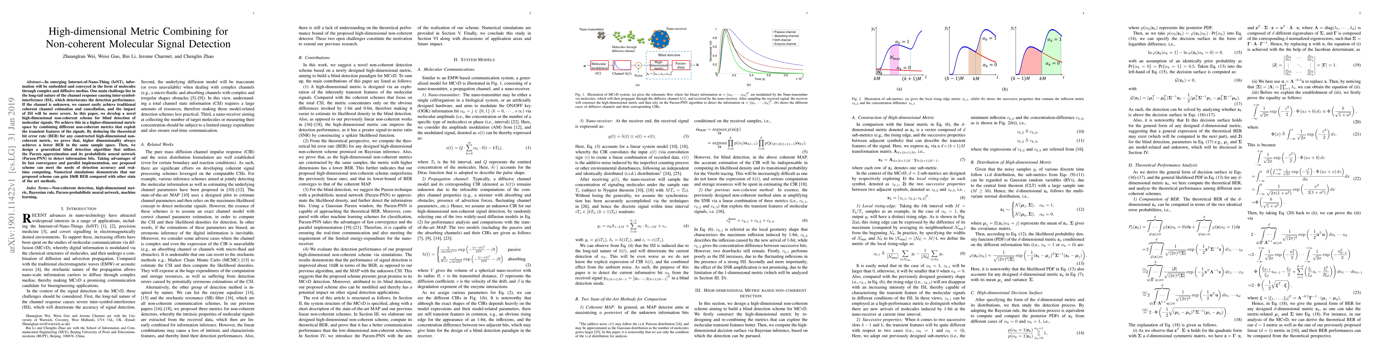 In emerging Internet-of-Nano-Thing (IoNT), information will be embedded and conveyed in the form of molecules through complex and diffusive medias. One main challenge lies in the long-tail nature of the channel response causing inter-symbol-interference (ISI), which deteriorates the detection performance. If the channel is unknown, we cannot easily achieve traditional coherent channel estimation and cancellation, and the impact of ISI will be more severe. In this paper, we develop a novel high-dimensional non-coherent scheme for blind detection of molecular signals. We achieve this in a higher-dimensional metric space by combining different non-coherent metrics that exploit the transient features of the signals. By deducing the theoretical bit error rate (BER) for any constructed high-dimensional non-coherent metric, we prove that, higher dimensionality always achieves a lower BER in the same sample space. Then, we design a generalised blind detection algorithm that utilizes the Parzen approximation and its probabilistic neural network (Parzen-PNN) to detect information bits. Taking advantages of its fast convergence and parallel implementation, our proposed scheme can meet the needs of detection accuracy and real-time computing. Numerical simulations demonstrate that our proposed scheme can gain 10dB BER compared with other state of the art methods.