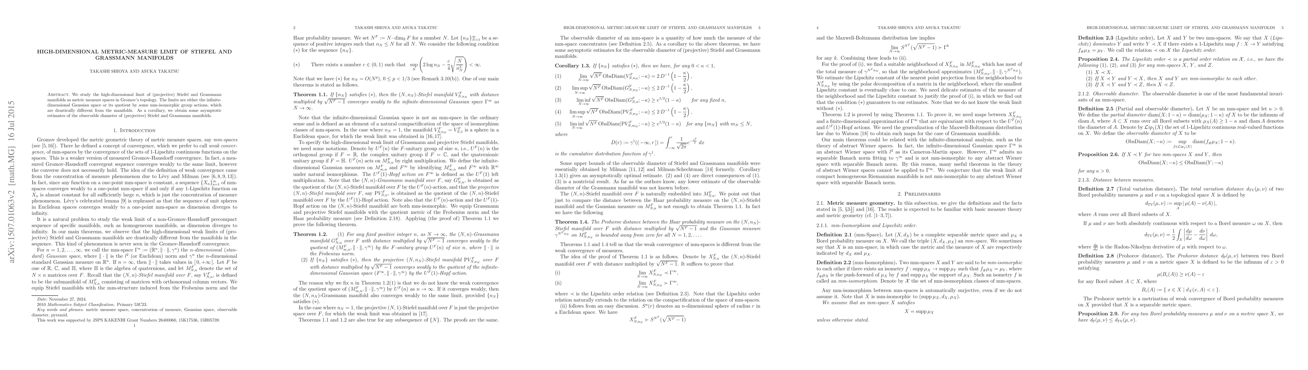 The paper investigates the high-dimensional limit behavior of Stiefel and Grassmann manifolds as metric-measure spaces, revealing they converge to either infinite-dimensional Gaussian spaces or their quotients, yielding new asymptotic diameter estimates.