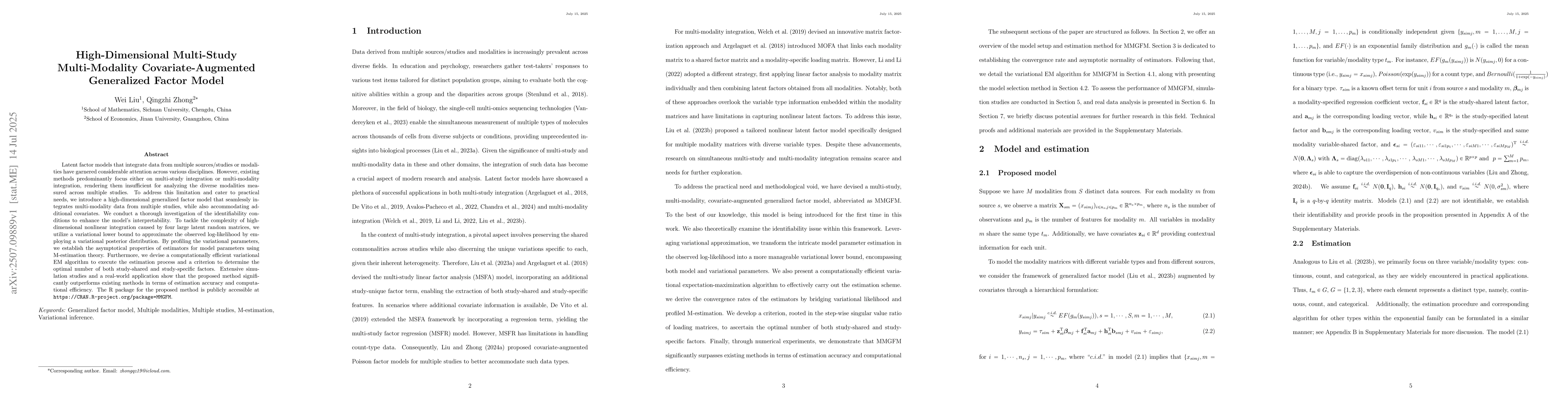 Latent factor models that integrate data from multiple sources/studies or modalities have garnered considerable attention across various disciplines. However, existing methods predominantly focus either on multi-study integration or multi-modality integration, rendering them insufficient for analyzing the diverse modalities measured across multiple studies. To address this limitation and cater to practical needs, we introduce a high-dimensional generalized factor model that seamlessly integrates multi-modality data from multiple studies, while also accommodating additional covariates. We conduct a thorough investigation of the identifiability conditions to enhance the model's interpretability. To tackle the complexity of high-dimensional nonlinear integration caused by four large latent random matrices, we utilize a variational lower bound to approximate the observed log-likelihood by employing a variational posterior distribution. By profiling the variational parameters, we establish the asymptotical properties of estimators for model parameters using M-estimation theory. Furthermore, we devise a computationally efficient variational EM algorithm to execute the estimation process and a criterion to determine the optimal number of both study-shared and study-specific factors. Extensive simulation studies and a real-world application show that the proposed method significantly outperforms existing methods in terms of estimation accuracy and computational efficiency. The R package for the proposed method is publicly accessible at https://CRAN.R-project.org/package=MMGFM.