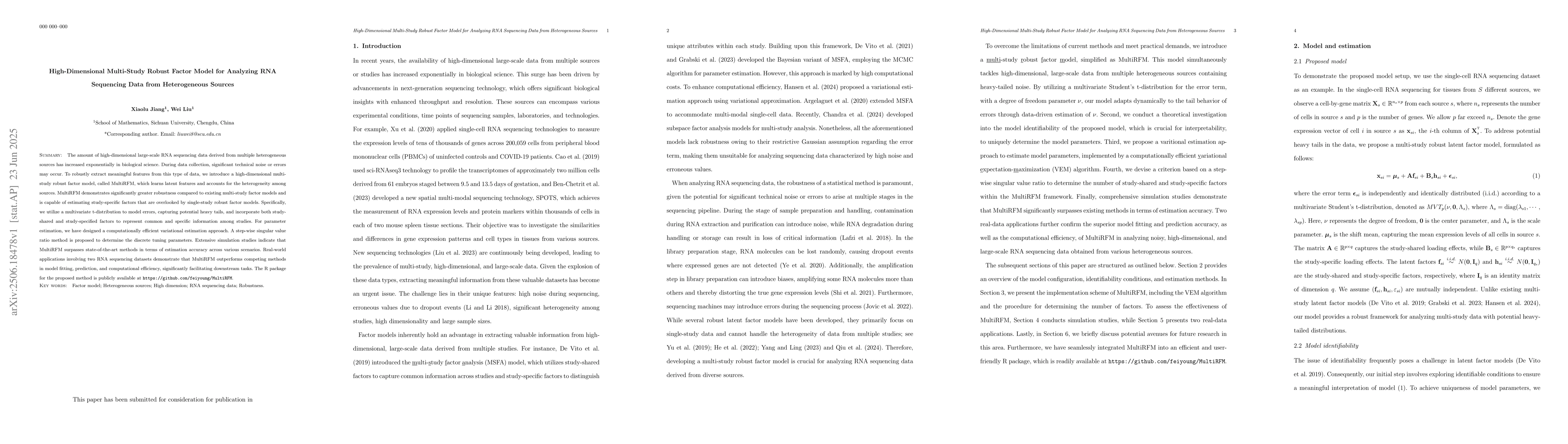 The amount of high-dimensional large-scale RNA sequencing data derived from multiple heterogeneous sources has increased exponentially in biological science. During data collection, significant technical noise or errors may occur. To robustly extract meaningful features from this type of data, we introduce a high-dimensional multi-study robust factor model, called MultiRFM, which learns latent features and accounts for the heterogeneity among sources. MultiRFM demonstrates significantly greater robustness compared to existing multi-study factor models and is capable of estimating study-specific factors that are overlooked by single-study robust factor models. Specifically,we utilize a multivariate t-distribution to model errors, capturing potential heavy tails, and incorporate both study-shared and study-specified factors to represent common and specific information among studies. For parameter estimation, we have designed a computationally efficient variational estimation approach. A step-wise singular value ratio method is proposed to determine the discrete tuning parameters. Extensive simulation studies indicate that MultiRFM surpasses state-of-the-art methods in terms of estimation accuracy across various scenarios. Real-world applications involving two RNA sequencing datasets demonstrate that MultiRFM outperforms competing methods in model fitting, prediction, and computational efficiency, significantly facilitating downstream tasks.