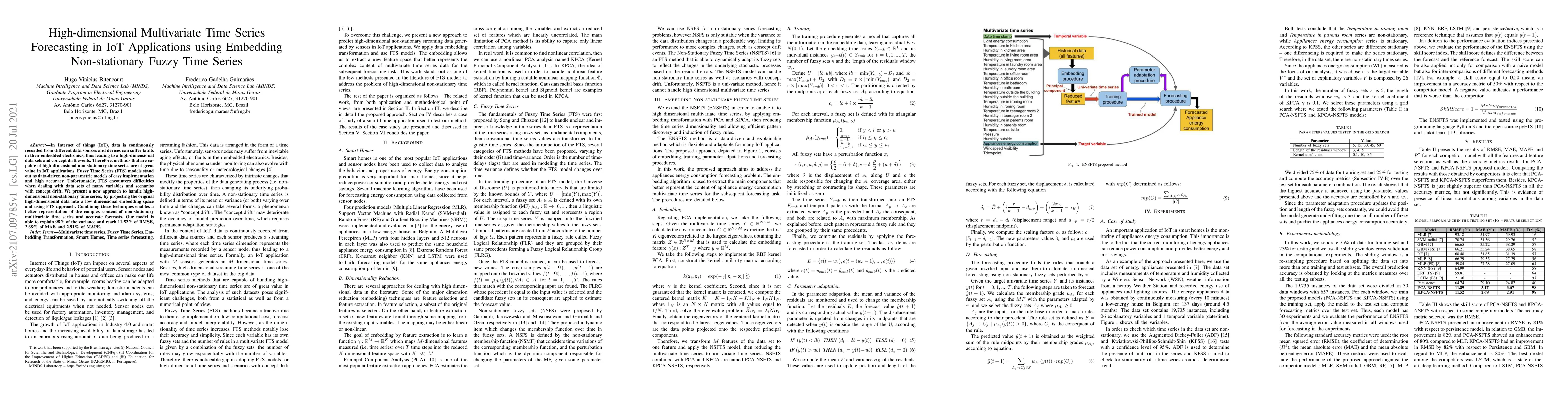 This paper proposes a novel method for high-dimensional multivariate time series forecasting in IoT applications by embedding non-stationary data into a lower-dimensional space using Fuzzy Time Series models. The approach achieves high accuracy, explaining 98% of variance and achieving low RMSE, MAE, and MAPE values.
