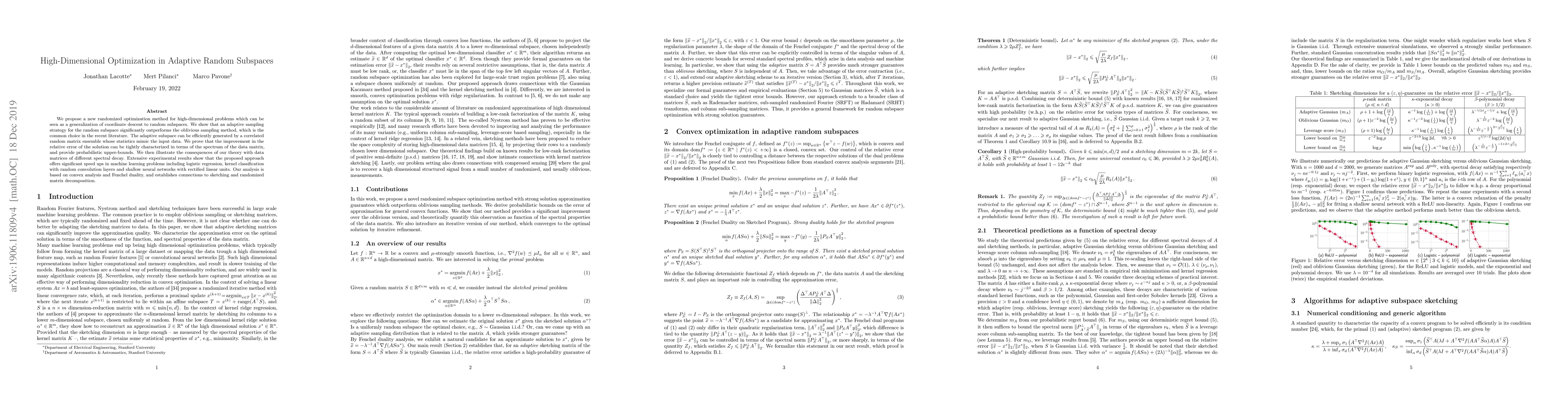 We propose a new randomized optimization method for high-dimensional problems which can be seen as a generalization of coordinate descent to random subspaces. We show that an adaptive sampling strategy for the random subspace significantly outperforms the oblivious sampling method, which is the common choice in the recent literature. The adaptive subspace can be efficiently generated by a correlated random matrix ensemble whose statistics mimic the input data. We prove that the improvement in the relative error of the solution can be tightly characterized in terms of the spectrum of the data matrix, and provide probabilistic upper-bounds. We then illustrate the consequences of our theory with data matrices of different spectral decay. Extensive experimental results show that the proposed approach offers significant speed ups in machine learning problems including logistic regression, kernel classification with random convolution layers and shallow neural networks with rectified linear units. Our analysis is based on convex analysis and Fenchel duality, and establishes connections to sketching and randomized matrix decomposition.