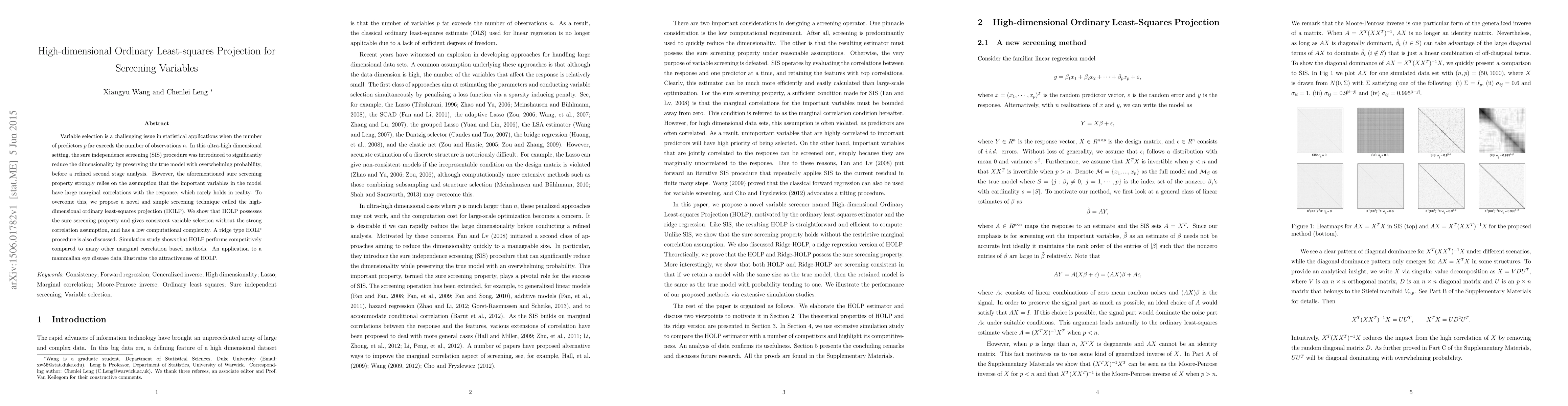 This paper introduces a new variable selection method called high-dimensional ordinary least-squares projection (HOLP), which offers consistent screening without relying on strong correlations between variables.