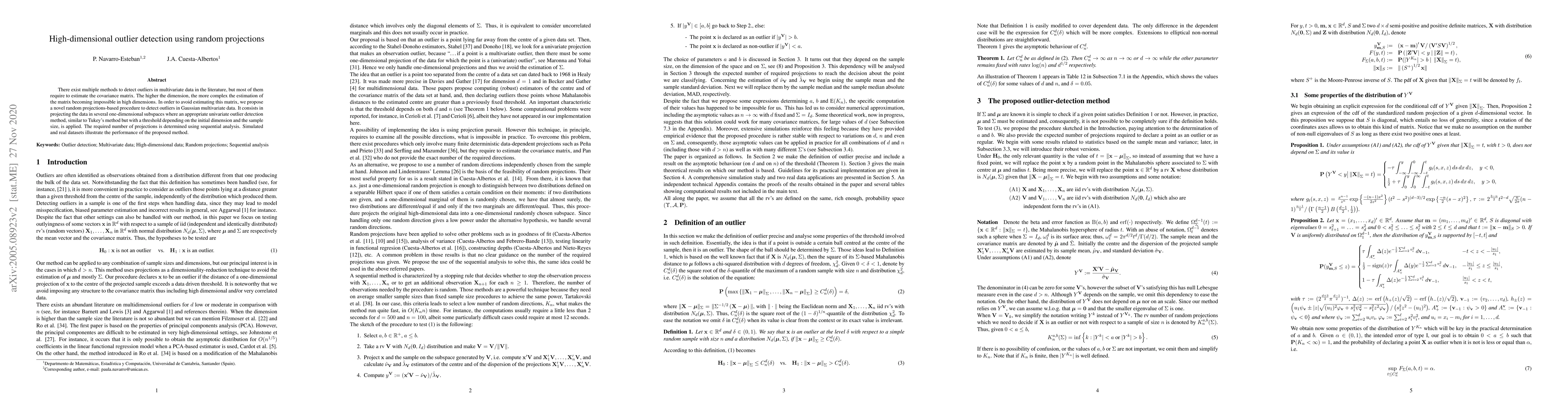 This paper proposes a novel random projections-based method for detecting outliers in high-dimensional Gaussian multivariate data without estimating the covariance matrix. It projects data into several one-dimensional subspaces, applies a modified Tukey's method, and determines the number of projections via sequential analysis, demonstrating effectiveness through simulations and real datasets.