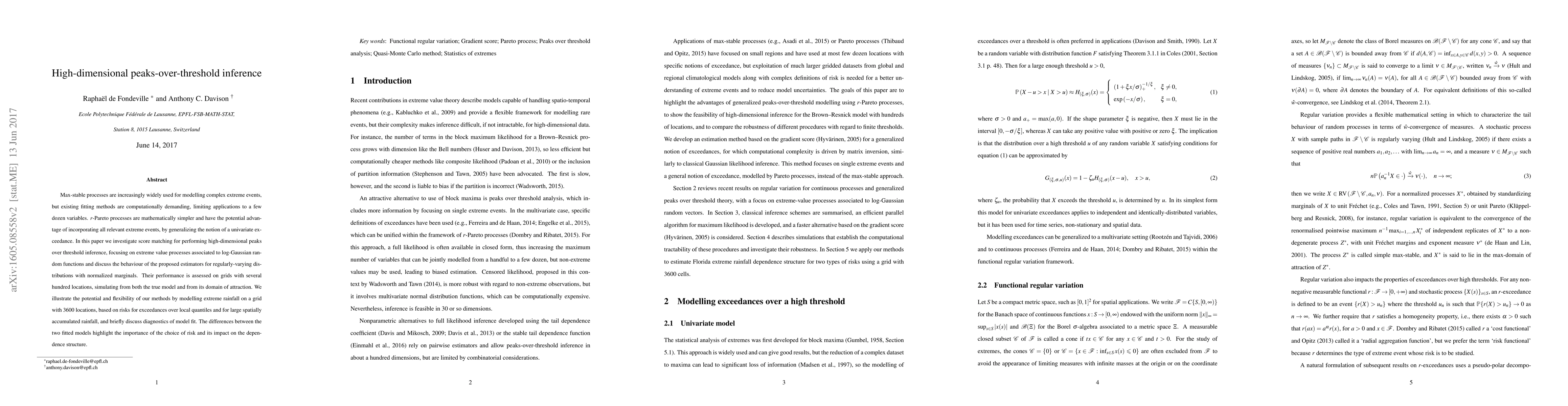This paper proposes score matching for high-dimensional peaks-over-threshold inference using $r$-Pareto processes, demonstrating its application on extreme rainfall data across 3600 locations. The method's performance is assessed through simulations, highlighting the impact of risk choice on the dependence structure.