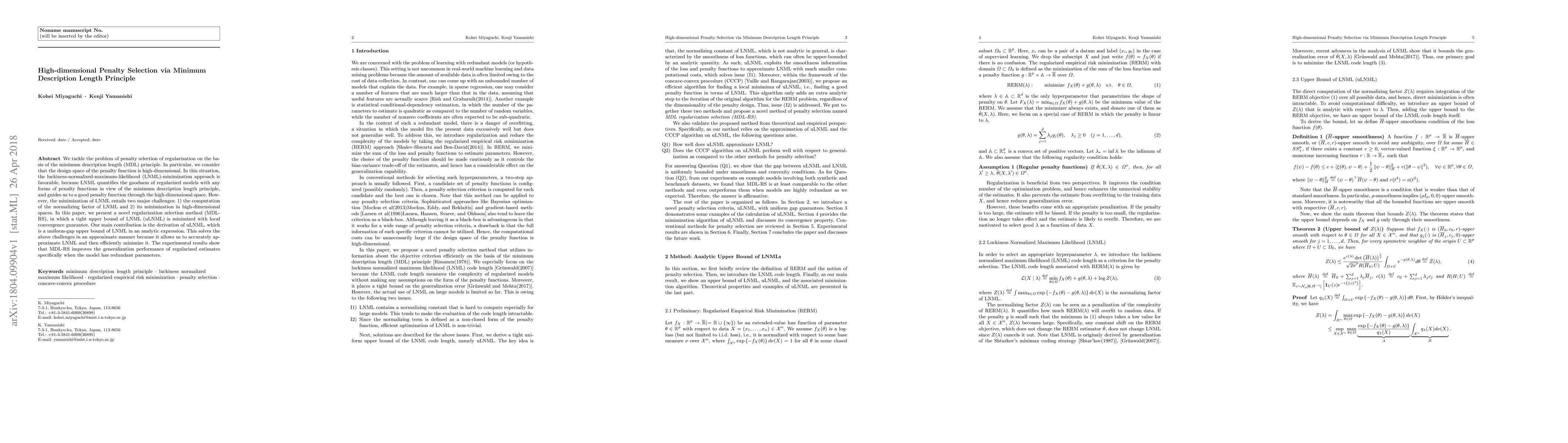 This paper proposes a novel regularization selection method (MDL-RS) based on the minimum description length principle to address high-dimensional penalty selection. It introduces a tight upper bound of the luckiness-normalized-maximum-likelihood (uLNML) to approximate and efficiently minimize LNML, thereby solving computational challenges and improving generalization performance in high-dimensional spaces.