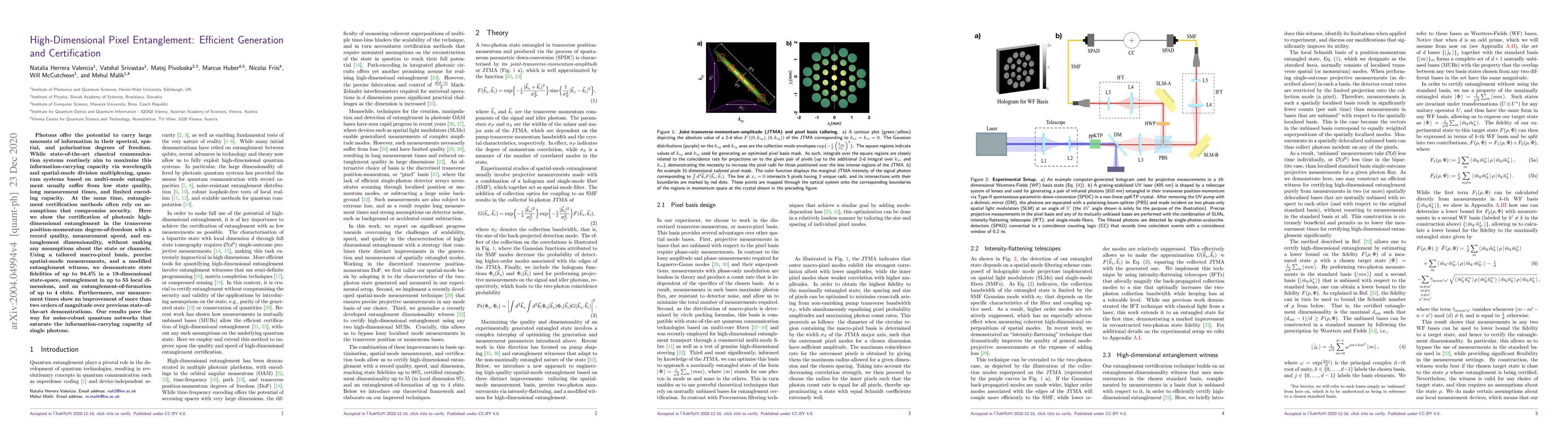 This paper presents a method for efficiently generating and certifying high-dimensional photonic entanglement in the transverse position-momentum degree-of-freedom, achieving record state fidelity, speed, and dimensionality without compromising security. The approach utilizes a tailored macro-pixel basis and precise spatial-mode measurements.
