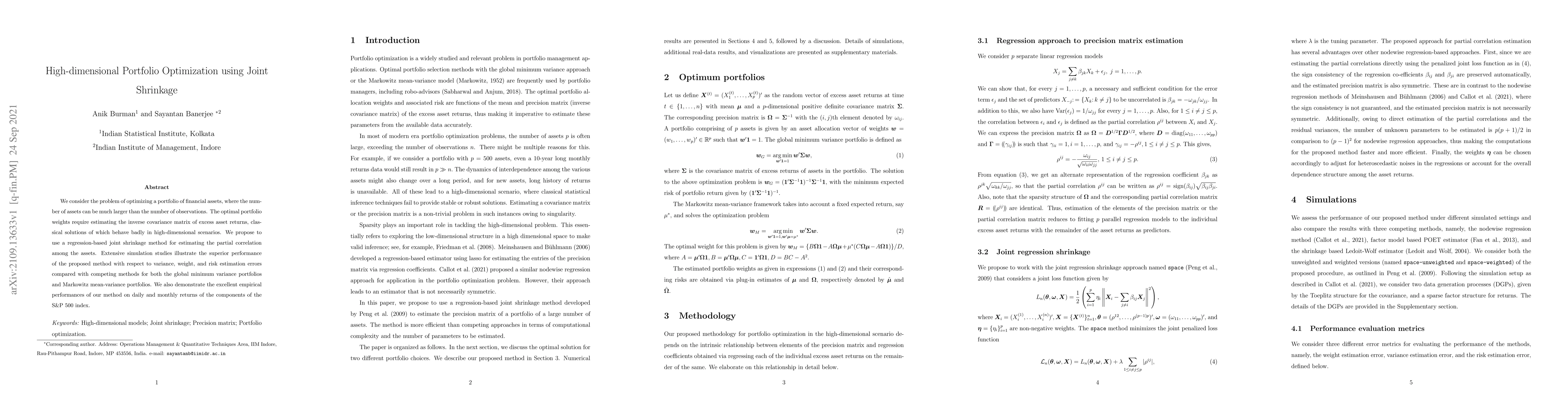 We consider the problem of optimizing a portfolio of financial assets, where the number of assets can be much larger than the number of observations. The optimal portfolio weights require estimating the inverse covariance matrix of excess asset returns, classical solutions of which behave badly in high-dimensional scenarios. We propose to use a regression-based joint shrinkage method for estimating the partial correlation among the assets. Extensive simulation studies illustrate the superior performance of the proposed method with respect to variance, weight, and risk estimation errors compared with competing methods for both the global minimum variance portfolios and Markowitz mean-variance portfolios. We also demonstrate the excellent empirical performances of our method on daily and monthly returns of the components of the S&P 500 index.