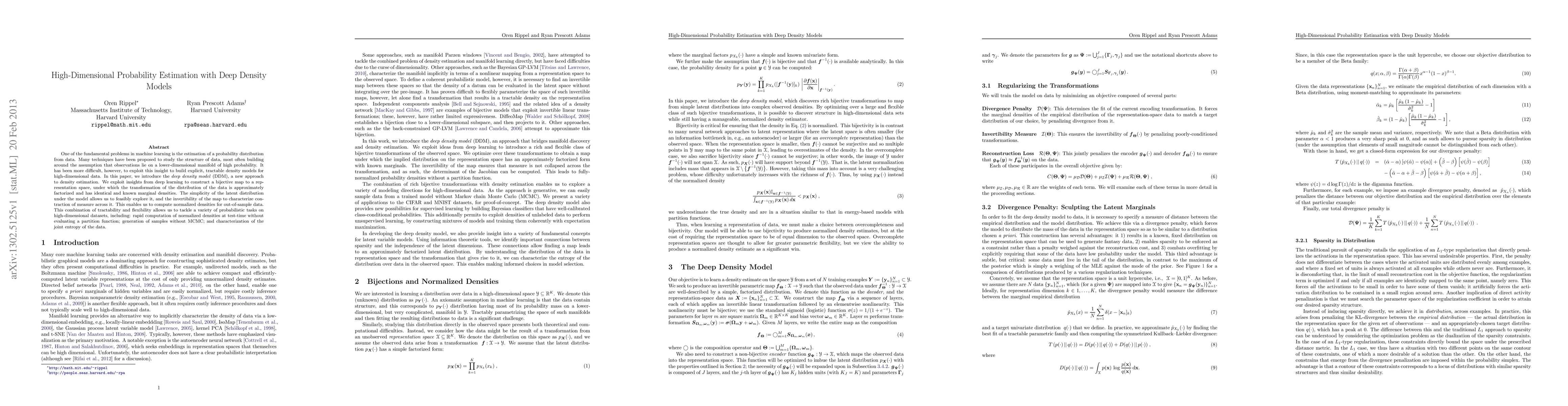 This paper introduces the deep density model (DDM) for estimating probability distributions in high-dimensional data. It leverages deep learning to create a bijective map to a simplified representation space, facilitating tractable density estimation and enabling tasks like rapid density computation and sample generation without MCMC.