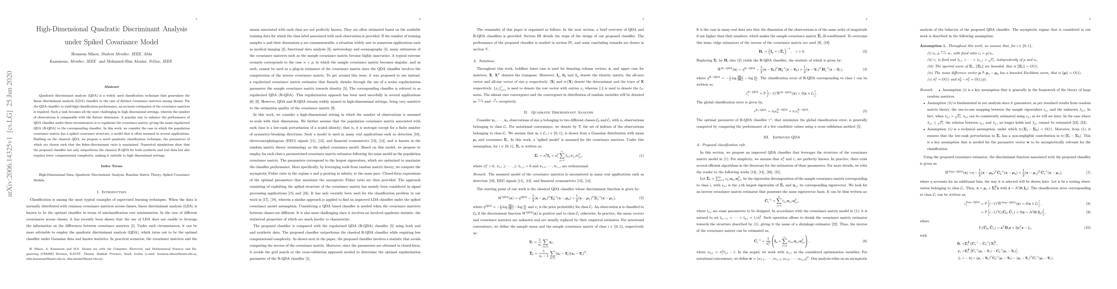The paper proposes an improved Quadratic Discriminant Analysis (QDA) classifier for high-dimensional data under a spiked covariance model. It maximizes the Fisher-discriminant ratio by optimizing parameters, using random matrix theory to estimate unknown quantities.