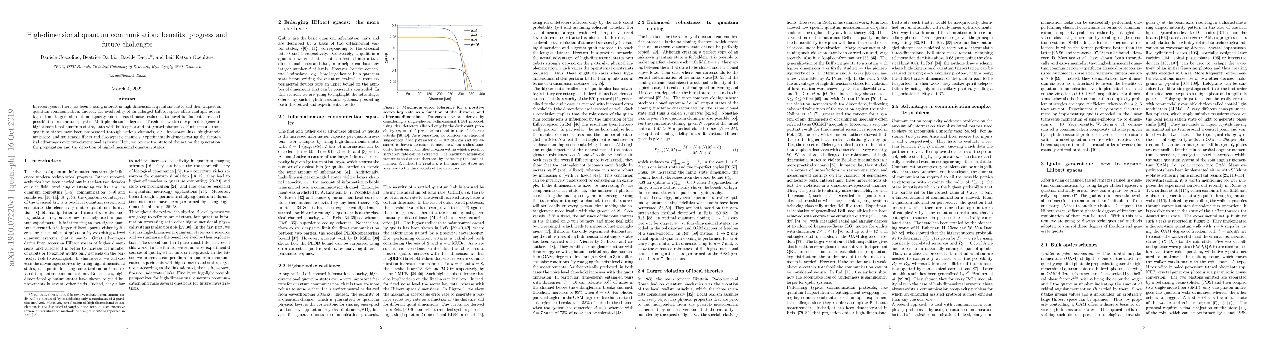 In recent years, there has been a rising interest in high-dimensional quantum states and their impact on quantum communication. Indeed, the availability of an enlarged Hilbert space offers multiple advantages, from larger information capacity and increased noise resilience, to novel fundamental research possibilities in quantum physics. Multiple photonic degrees of freedom have been explored to generate high-dimensional quantum states, both with bulk optics and integrated photonics. Furthermore, these quantum states have been propagated through various channels, \textit{e.g.} free-space links, single-mode, multicore, and multimode fibers and also aquatic channels, experimentally demonstrating the theoretical advantages over two-dimensional systems. Here, we review the state of the art on the generation, the propagation and the detection of high-dimensional quantum states.