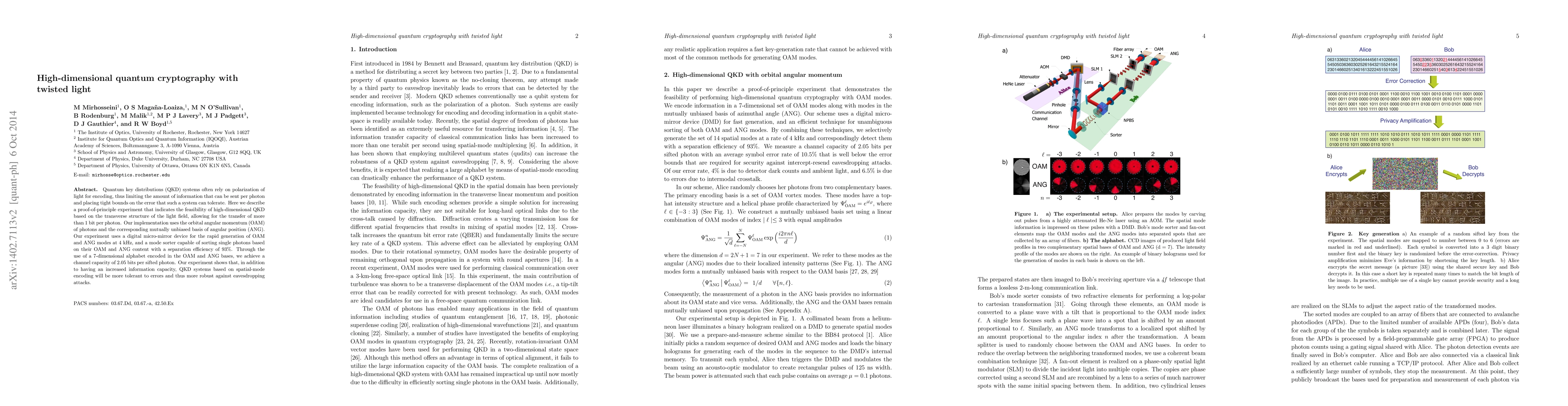 Quantum key distributions (QKD) systems often rely on polarization of light for encoding, thus limiting the amount of information that can be sent per photon and placing tight bounds on the error that such a system can tolerate. Here we describe a proof-of-principle experiment that indicates the feasibility of high-dimensional QKD based on the transverse structure of the light field, allowing for the transfer of more than 1 bit per photon. Our implementation uses the orbital angular momentum (OAM) of photons and the corresponding mutually unbiased basis of angular position (ANG). Our experiment uses a digital micro-mirror device for the rapid generation of OAM and ANG modes at 4 kHz, and a mode sorter capable of sorting single photons based on their OAM and ANG content with a separation efficiency of 93\%. Through the use of a 7-dimensional alphabet encoded in the OAM and ANG bases, we achieve a channel capacity of 2.05 bits per sifted photon. Our experiment shows that, in addition to having an increased information capacity, QKD systems based on spatial-mode encoding will be more tolerant to errors and thus more robust against eavesdropping attacks.