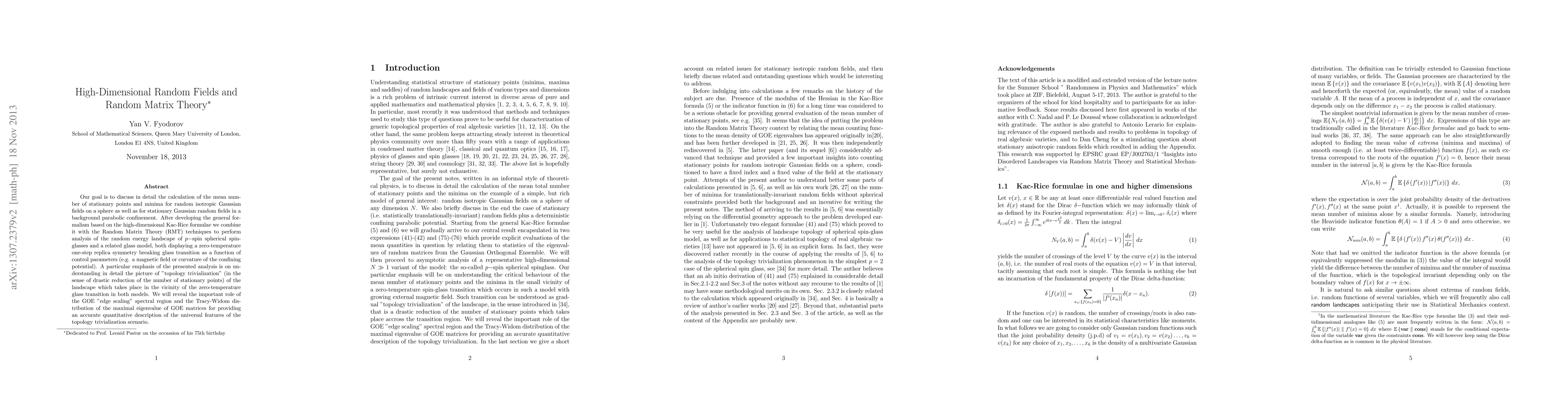 This paper explores the calculation of stationary points and minima in high-dimensional Gaussian fields using high-dimensional Kac-Rice formulae and Random Matrix Theory. It focuses on the "topology trivialization" phenomenon near the zero-temperature glass transition, revealing the role of GOE spectral regions and Tracy-Widom distributions in describing the universal features of this transition.