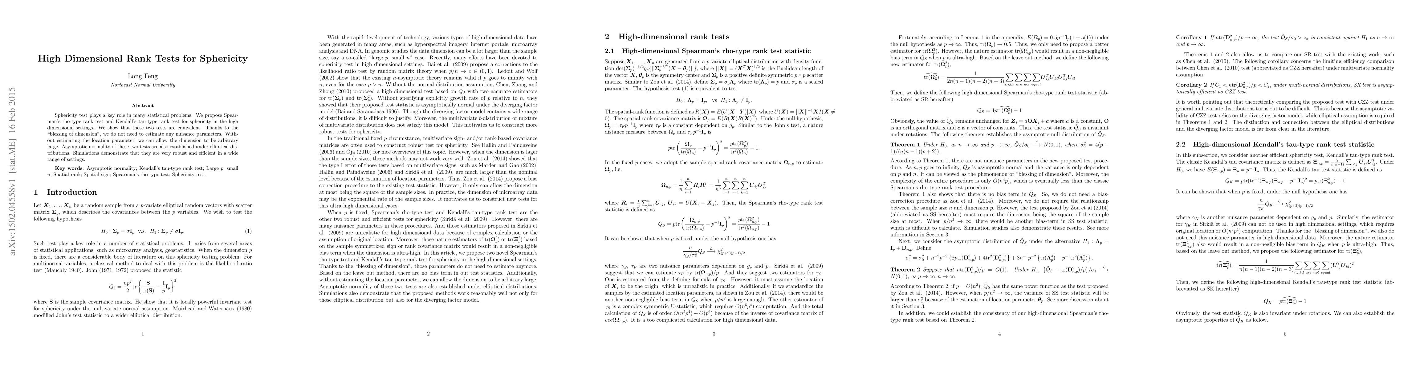 This paper proposes two high-dimensional rank tests—Spearman's rho-type and Kendall's tau-type—for sphericity, demonstrating their equivalence and asymptotic normality under elliptical distributions. The tests are robust and efficient without requiring the estimation of nuisance parameters.