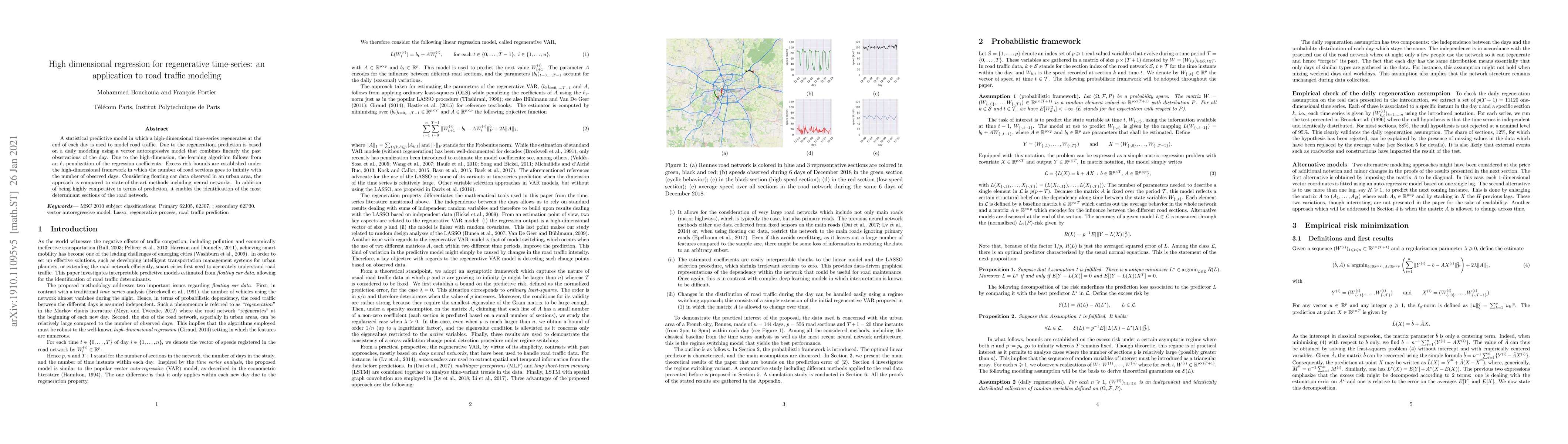 This paper proposes a high-dimensional regression model for daily road traffic prediction, employing a vector autoregressive approach with L1-penalization to handle regeneration at the end of each day. The method is competitive against state-of-the-art techniques and identifies key traffic sections.