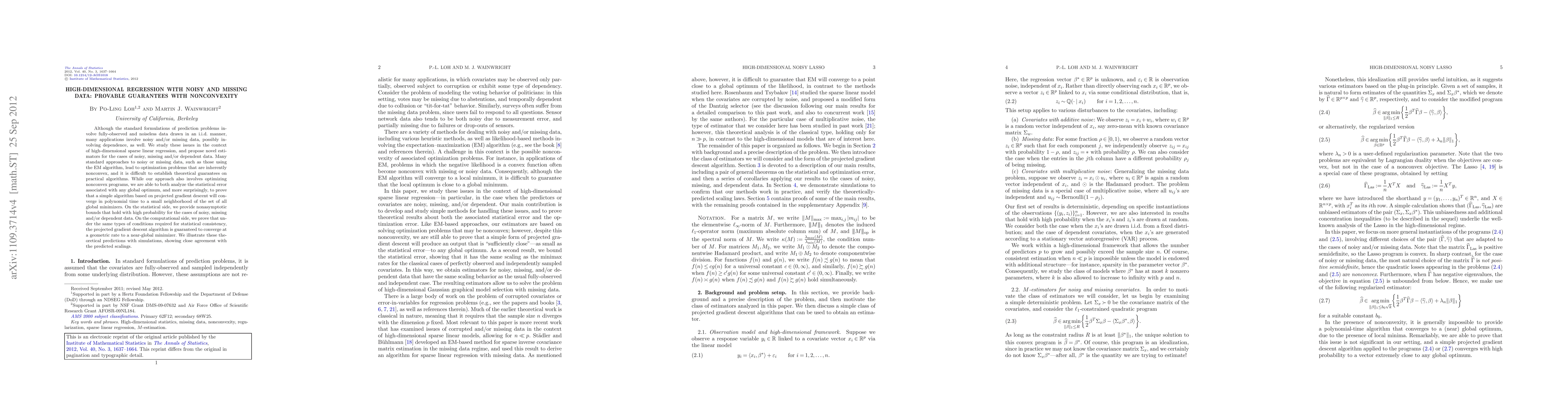 Although the standard formulations of prediction problems involve fully-observed and noiseless data drawn in an i.i.d. manner, many applications involve noisy and/or missing data, possibly involving dependence, as well. We study these issues in the context of high-dimensional sparse linear regression, and propose novel estimators for the cases of noisy, missing and/or dependent data. Many standard approaches to noisy or missing data, such as those using the EM algorithm, lead to optimization problems that are inherently nonconvex, and it is difficult to establish theoretical guarantees on practical algorithms. While our approach also involves optimizing nonconvex programs, we are able to both analyze the statistical error associated with any global optimum, and more surprisingly, to prove that a simple algorithm based on projected gradient descent will converge in polynomial time to a small neighborhood of the set of all global minimizers. On the statistical side, we provide nonasymptotic bounds that hold with high probability for the cases of noisy, missing and/or dependent data. On the computational side, we prove that under the same types of conditions required for statistical consistency, the projected gradient descent algorithm is guaranteed to converge at a geometric rate to a near-global minimizer. We illustrate these theoretical predictions with simulations, showing close agreement with the predicted scalings.
