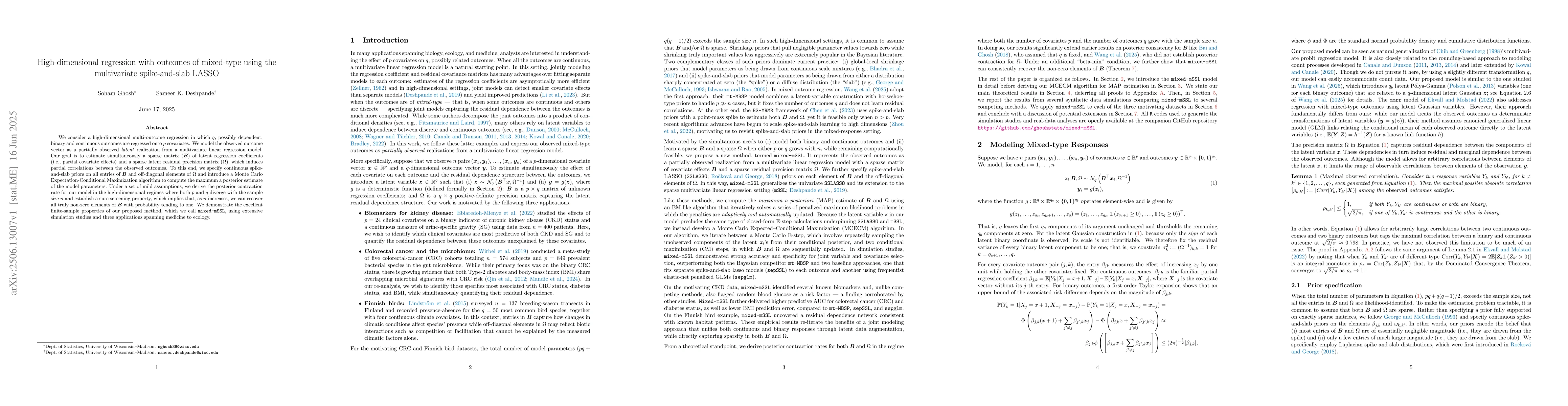 We consider a high-dimensional multi-outcome regression in which $q,$ possibly dependent, binary and continuous outcomes are regressed onto $p$ covariates. We model the observed outcome vector as a partially observed latent realization from a multivariate linear regression model. Our goal is to estimate simultaneously a sparse matrix ($B$) of latent regression coefficients (i.e., partial covariate effects) and a sparse latent residual precision matrix ($\Omega$), which induces partial correlations between the observed outcomes. To this end, we specify continuous spike-and-slab priors on all entries of $B$ and off-diagonal elements of $\Omega$ and introduce a Monte Carlo Expectation-Conditional Maximization algorithm to compute the maximum a posterior estimate of the model parameters. Under a set of mild assumptions, we derive the posterior contraction rate for our model in the high-dimensional regimes where both $p$ and $q$ diverge with the sample size $n$ and establish a sure screening property, which implies that, as $n$ increases, we can recover all truly non-zero elements of $B$ with probability tending to one. We demonstrate the excellent finite-sample properties of our proposed method, which we call mixed-mSSL, using extensive simulation studies and three applications spanning medicine to ecology.