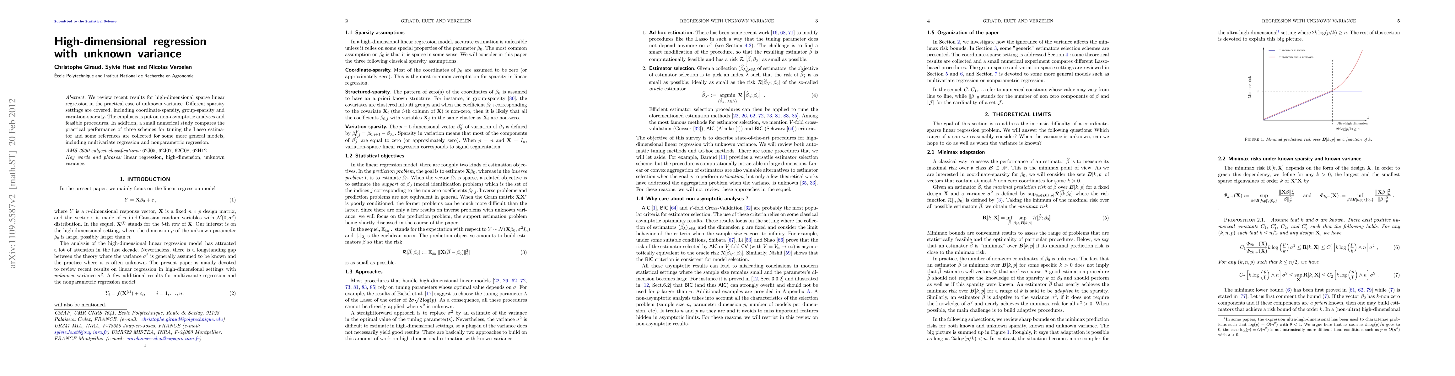 We review recent results for high-dimensional sparse linear regression in the practical case of unknown variance. Different sparsity settings are covered, including coordinate-sparsity, group-sparsity and variation-sparsity. The emphasis is put on non-asymptotic analyses and feasible procedures. In addition, a small numerical study compares the practical performance of three schemes for tuning the Lasso estimator and some references are collected for some more general models, including multivariate regression and nonparametric regression.