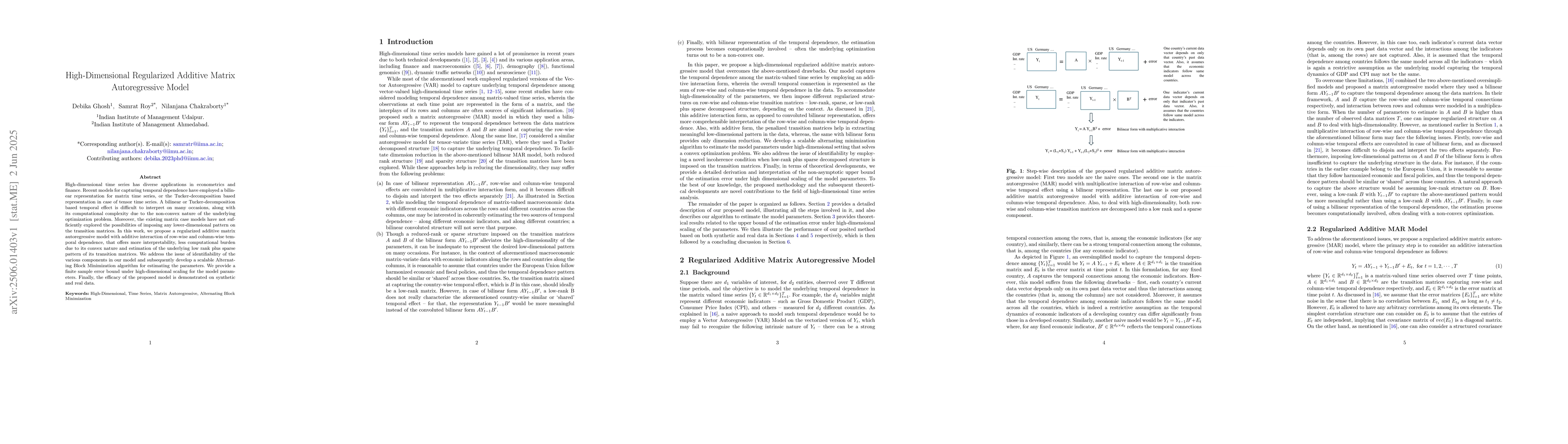 The paper proposes a regularized additive matrix autoregressive model with additive interaction of row-wise and column-wise temporal dependence, addressing identifiability issues via an Alternating Block Minimization algorithm and providing a finite sample error bound.