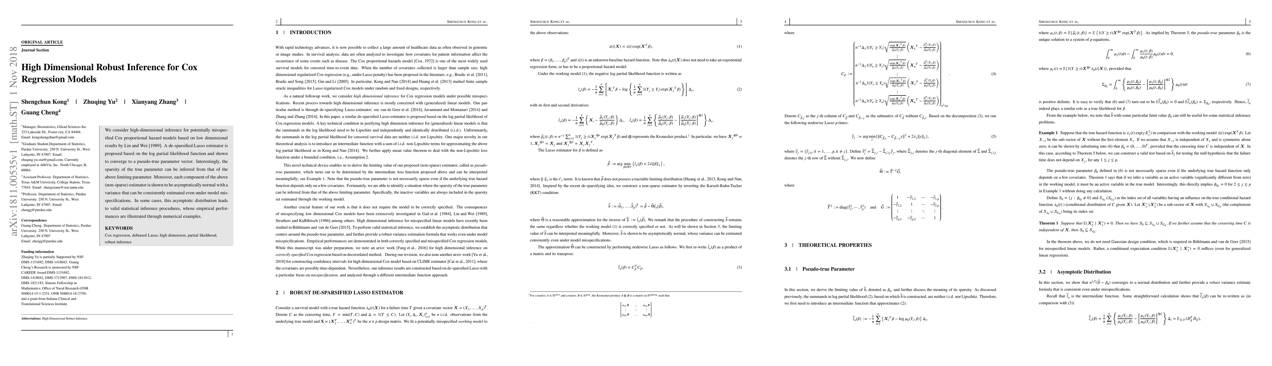 A new method is proposed for analyzing Cox regression models with many variables, allowing for accurate inference even when some variables are irrelevant or incorrectly included. The approach uses a de-sparsified Lasso estimator that can provide reliable statistical inferences.