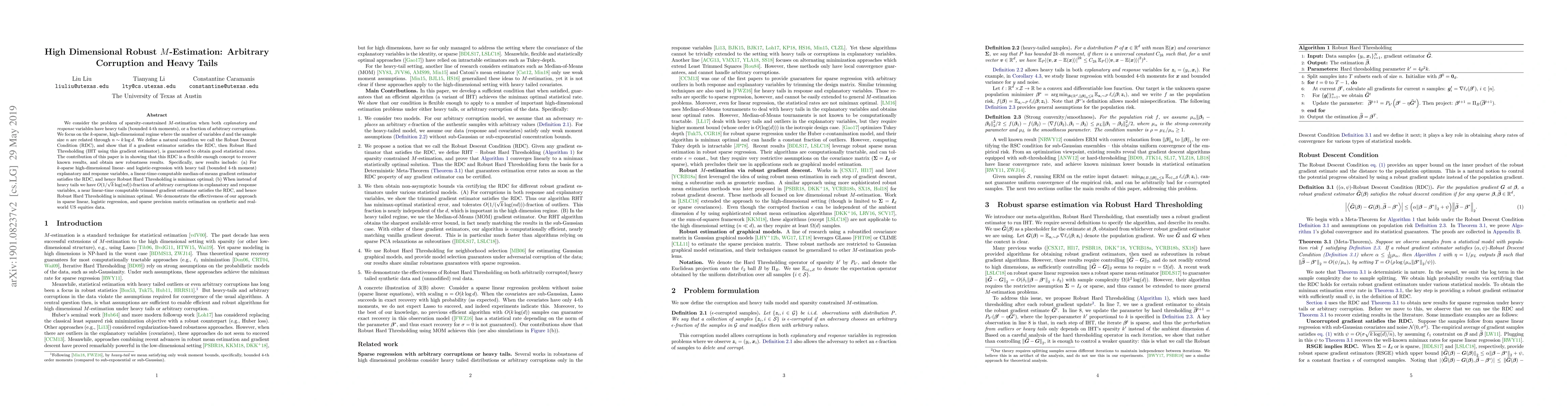 We consider the problem of sparsity-constrained $M$-estimation when both explanatory and response variables have heavy tails (bounded 4-th moments), or a fraction of arbitrary corruptions. We focus on the $k$-sparse, high-dimensional regime where the number of variables $d$ and the sample size $n$ are related through $n \sim k \log d$. We define a natural condition we call the Robust Descent Condition (RDC), and show that if a gradient estimator satisfies the RDC, then Robust Hard Thresholding (IHT using this gradient estimator), is guaranteed to obtain good statistical rates. The contribution of this paper is in showing that this RDC is a flexible enough concept to recover known results, and obtain new robustness results. Specifically, new results include: (a) For $k$-sparse high-dimensional linear- and logistic-regression with heavy tail (bounded 4-th moment) explanatory and response variables, a linear-time-computable median-of-means gradient estimator satisfies the RDC, and hence Robust Hard Thresholding is minimax optimal; (b) When instead of heavy tails we have $O(1/\sqrt{k}\log(nd))$-fraction of arbitrary corruptions in explanatory and response variables, a near linear-time computable trimmed gradient estimator satisfies the RDC, and hence Robust Hard Thresholding is minimax optimal. We demonstrate the effectiveness of our approach in sparse linear, logistic regression, and sparse precision matrix estimation on synthetic and real-world US equities data.