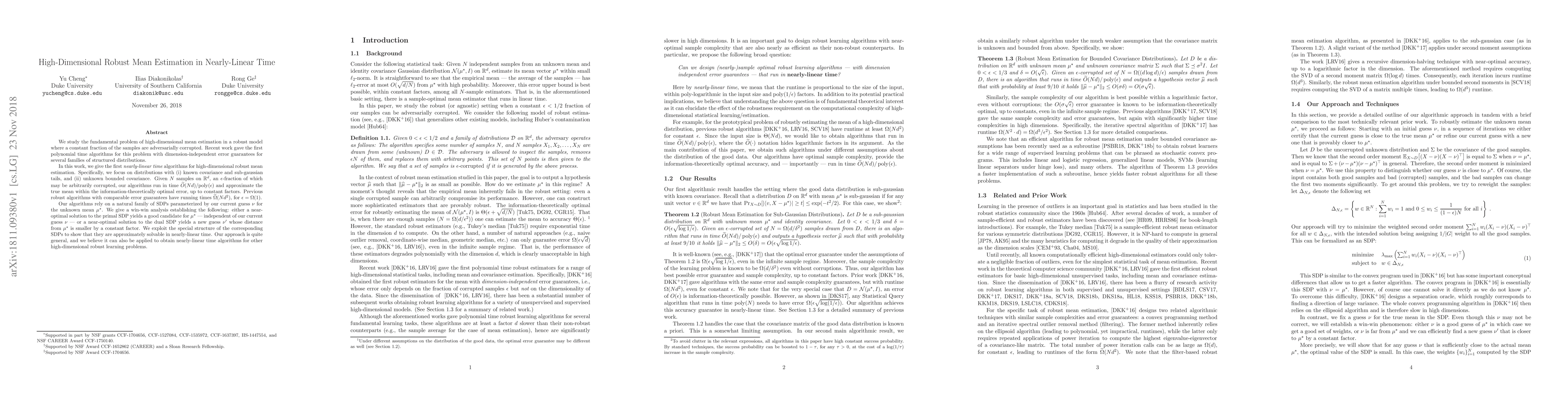 The paper presents a novel algorithm for high-dimensional robust mean estimation in nearly-linear time, applicable to distributions with known covariance and sub-gaussian tails, as well as those with unknown bounded covariance. It introduces a win-win analysis based on a family of SDPs parameterized by the current guess for the unknown mean.