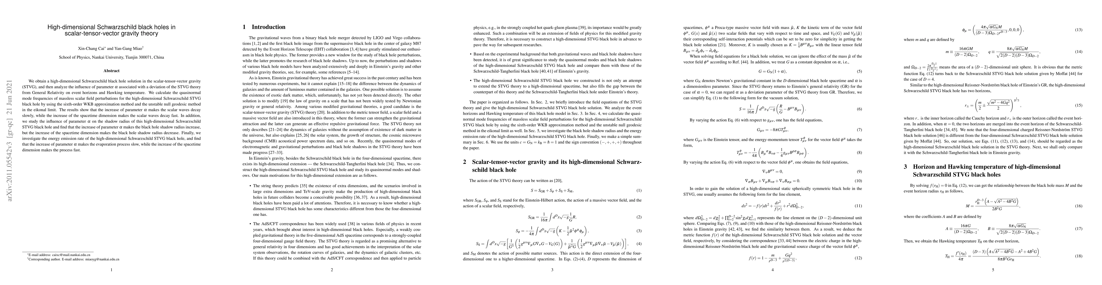 This paper presents a high-dimensional Schwarzschild black hole solution in scalar-tensor-vector gravity (STVG) and examines the effects of the parameter $\alpha$ on event horizons, Hawking temperature, quasinormal modes, and shadow radius. The study finds that higher $\alpha$ slows decay and evaporation, while increased spacetime dimensions accelerate these processes.
