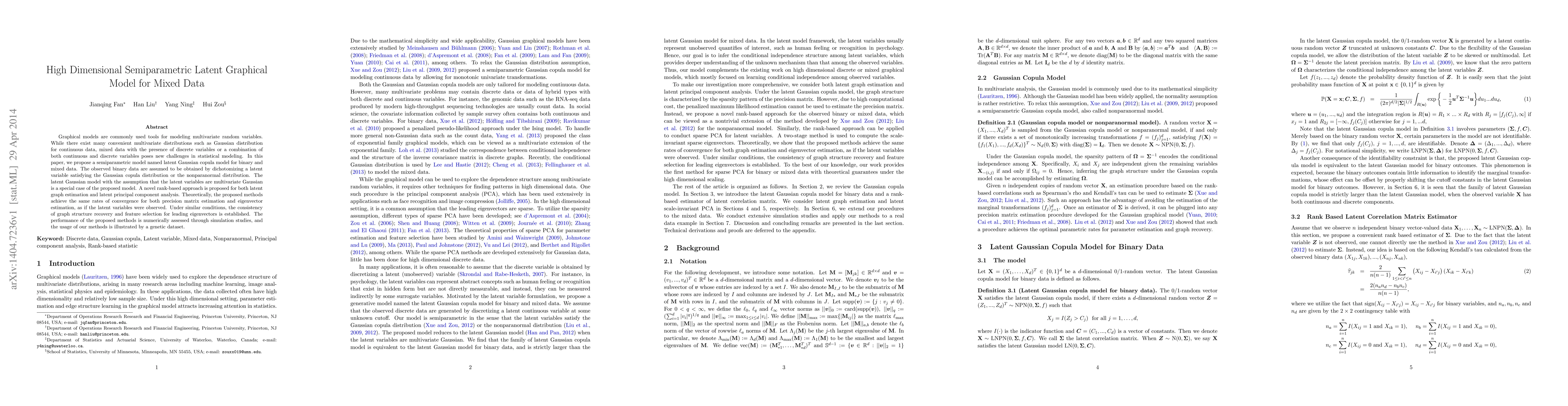 Graphical models are commonly used tools for modeling multivariate random variables. While there exist many convenient multivariate distributions such as Gaussian distribution for continuous data, mixed data with the presence of discrete variables or a combination of both continuous and discrete variables poses new challenges in statistical modeling. In this paper, we propose a semiparametric model named latent Gaussian copula model for binary and mixed data. The observed binary data are assumed to be obtained by dichotomizing a latent variable satisfying the Gaussian copula distribution or the nonparanormal distribution. The latent Gaussian model with the assumption that the latent variables are multivariate Gaussian is a special case of the proposed model. A novel rank-based approach is proposed for both latent graph estimation and latent principal component analysis. Theoretically, the proposed methods achieve the same rates of convergence for both precision matrix estimation and eigenvector estimation, as if the latent variables were observed. Under similar conditions, the consistency of graph structure recovery and feature selection for leading eigenvectors is established. The performance of the proposed methods is numerically assessed through simulation studies, and the usage of our methods is illustrated by a genetic dataset.