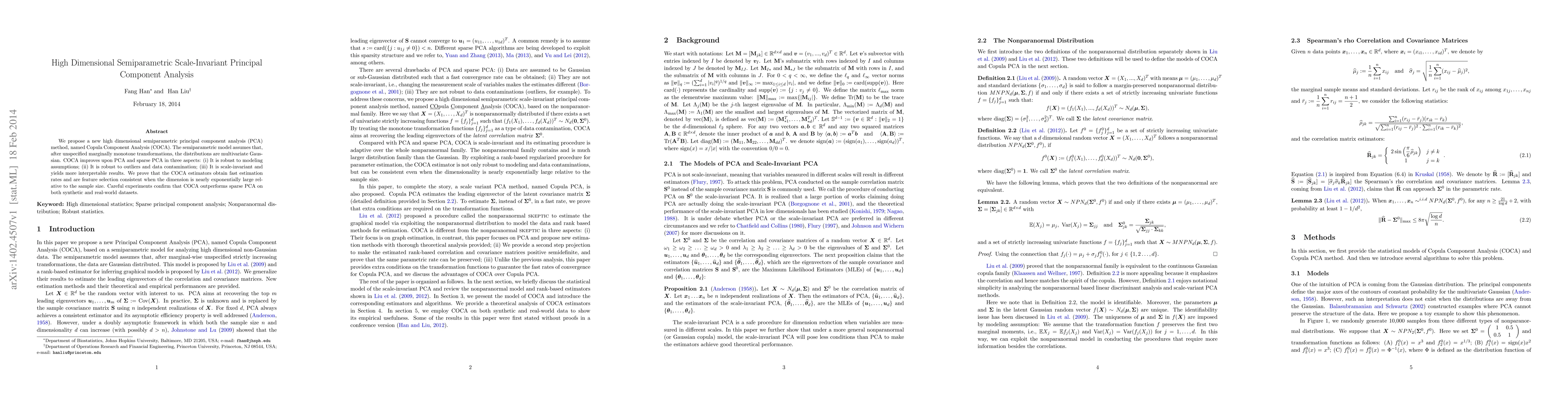 This paper introduces a new semiparametric method called Copula Component Analysis (COCA) for high-dimensional PCA, which assumes marginally monotone transformations to Gaussian distributions. COCA is robust to outliers, data contamination, and scale-invariant, outperforming sparse PCA in both synthetic and real datasets.