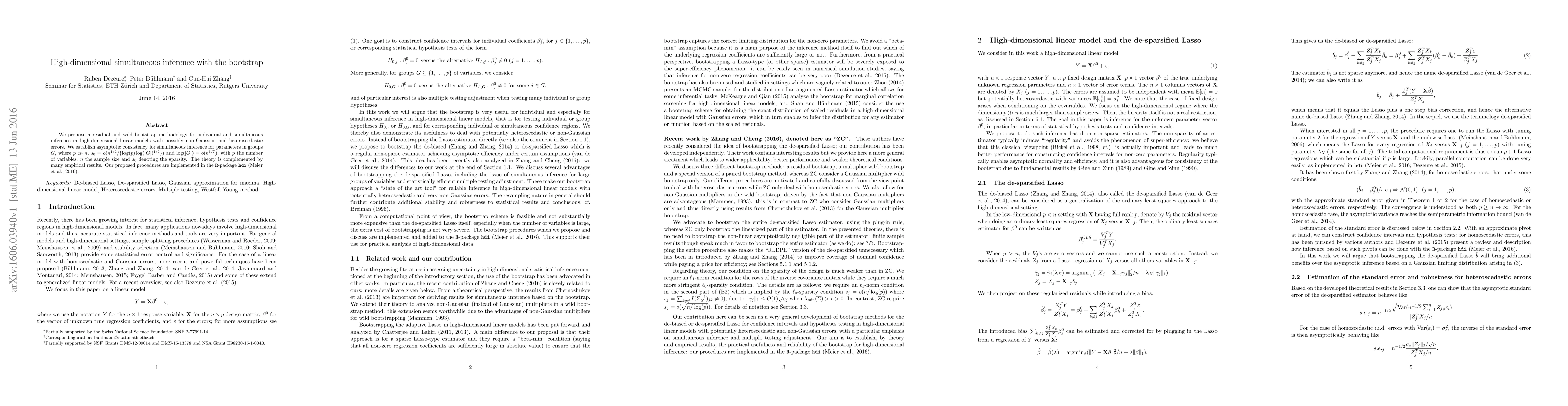This paper proposes a bootstrap methodology for simultaneous inference in high-dimensional linear models, addressing non-Gaussian and heteroscedastic errors. It establishes asymptotic consistency under conditions where the number of variables greatly exceeds the sample size, and provides empirical results supporting the methodology.