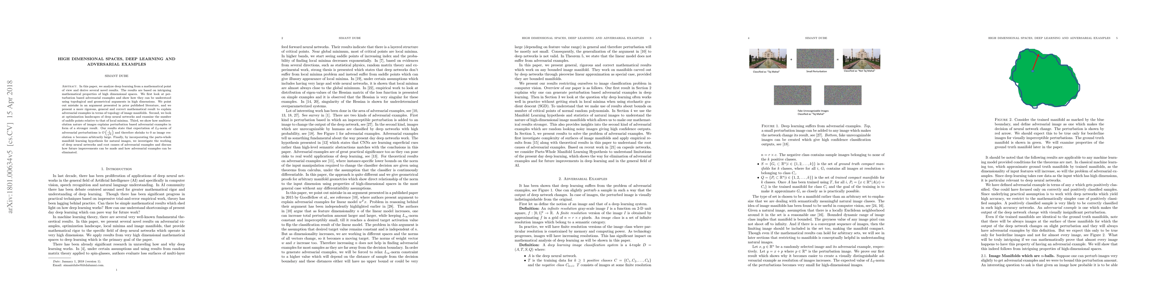This paper mathematically analyzes deep learning, focusing on adversarial examples and optimization landscapes in high-dimensional spaces. It corrects a prior error and rigorously explains adversarial perturbations using topological arguments, showing that their $L_2$-norm diminishes with increasing image resolution.