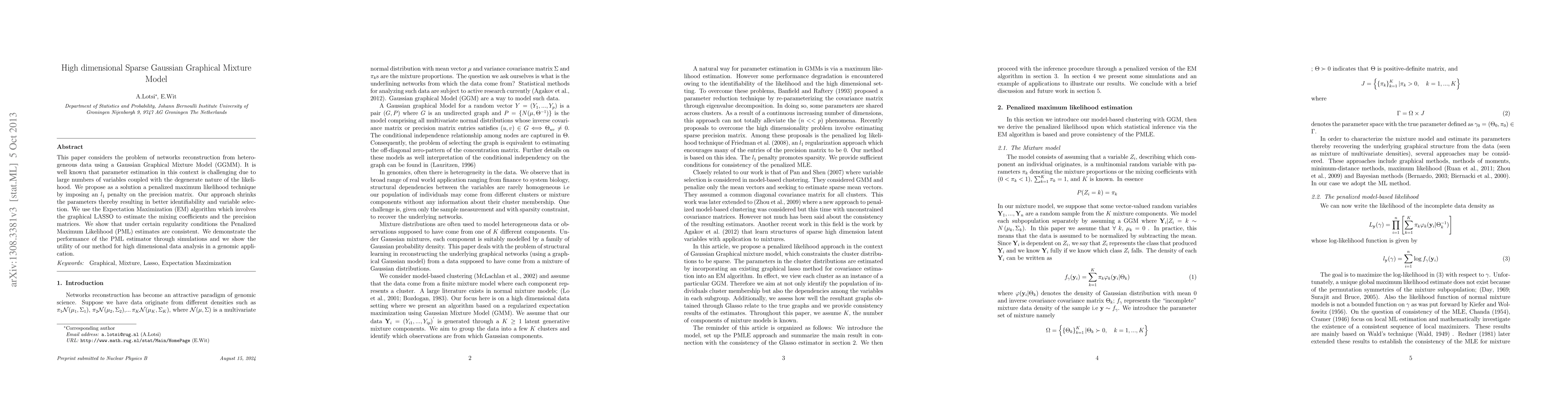 This paper considers the problem of networks reconstruction from heterogeneous data using a Gaussian Graphical Mixture Model (GGMM). It is well known that parameter estimation in this context is challenging due to large numbers of variables coupled with the degeneracy of the likelihood. We propose as a solution a penalized maximum likelihood technique by imposing an $l_{1}$ penalty on the precision matrix. Our approach shrinks the parameters thereby resulting in better identifiability and variable selection. We use the Expectation Maximization (EM) algorithm which involves the graphical LASSO to estimate the mixing coefficients and the precision matrices. We show that under certain regularity conditions the Penalized Maximum Likelihood (PML) estimates are consistent. We demonstrate the performance of the PML estimator through simulations and we show the utility of our method for high dimensional data analysis in a genomic application.