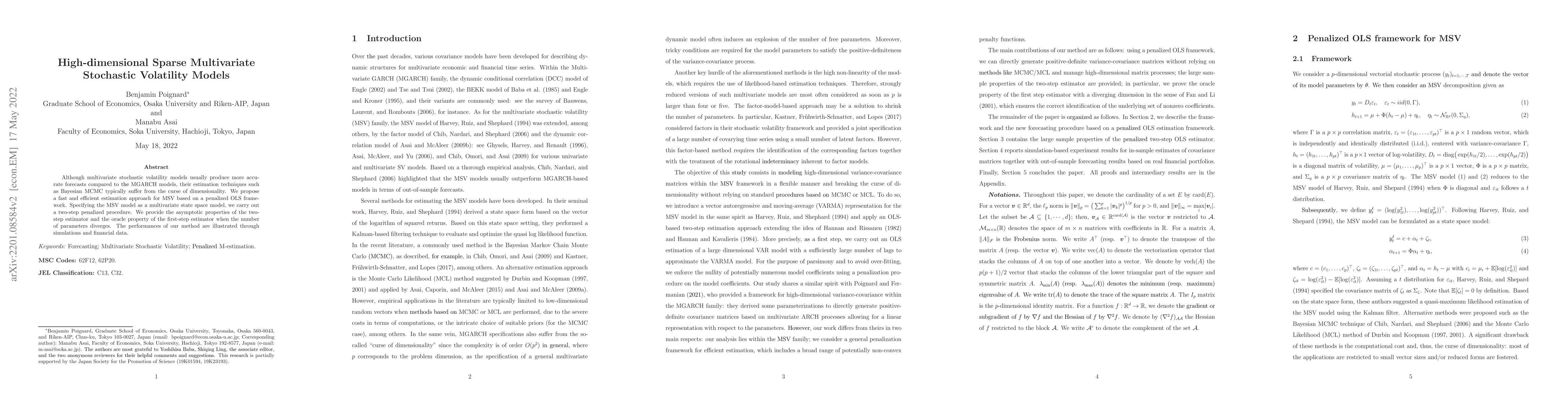 This paper proposes a fast estimation method for high-dimensional sparse multivariate stochastic volatility (MSV) models using a penalized OLS framework, addressing the curse of dimensionality. The method is shown to perform well through simulations and financial data analysis.