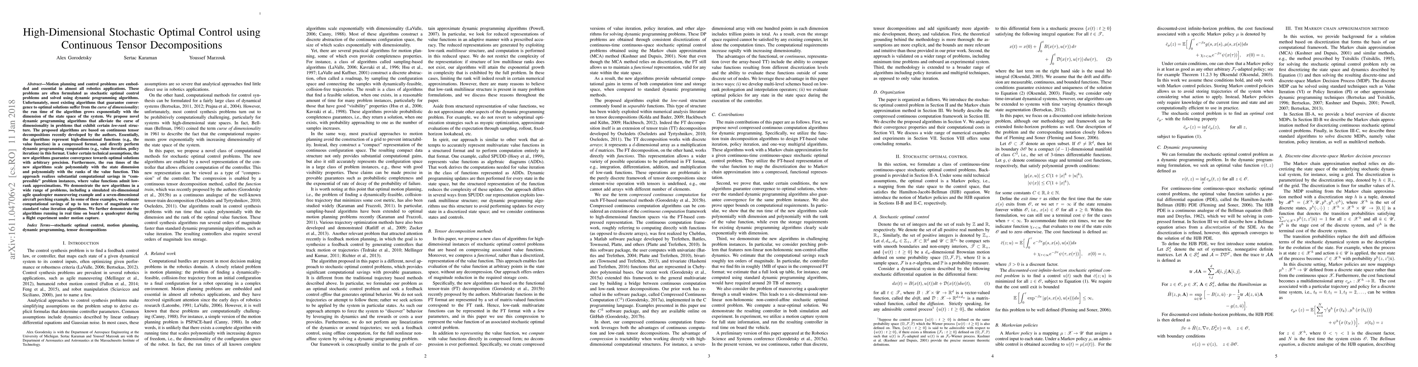 This paper proposes dynamic programming algorithms for high-dimensional stochastic optimal control problems, leveraging continuous tensor decompositions to represent value functions in a compressed format. The new algorithms achieve polynomial scaling with state dimensions and ranks, offering substantial computational savings in low-rank scenarios, demonstrated through examples including agile quadcopter maneuvers and aircraft perching.