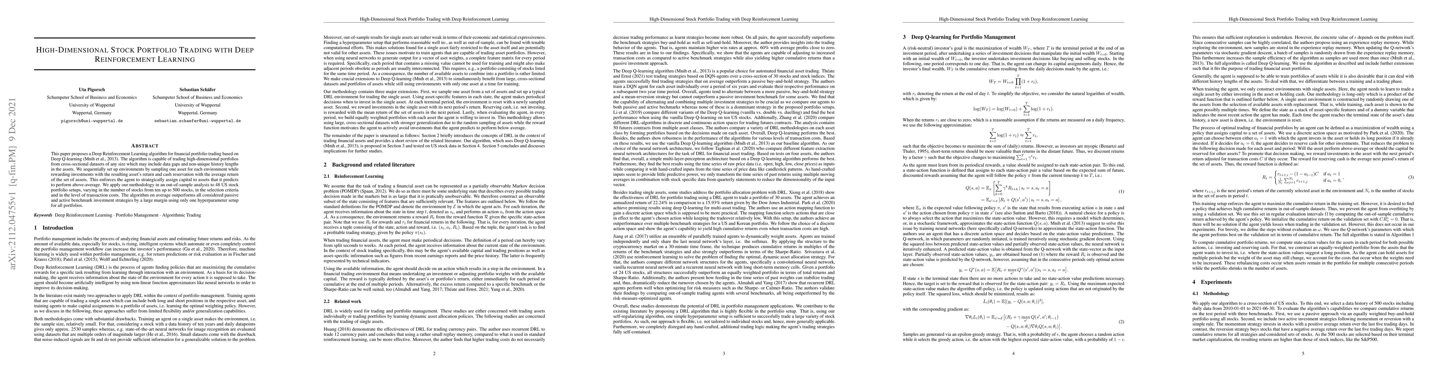 This paper proposes a Deep Reinforcement Learning algorithm for financial portfolio trading based on Deep Q-learning. The algorithm is capable of trading high-dimensional portfolios from cross-sectional datasets of any size which may include data gaps and non-unique history lengths in the assets. We sequentially set up environments by sampling one asset for each environment while rewarding investments with the resulting asset's return and cash reservation with the average return of the set of assets. This enforces the agent to strategically assign capital to assets that it predicts to perform above-average. We apply our methodology in an out-of-sample analysis to 48 US stock portfolio setups, varying in the number of stocks from ten up to 500 stocks, in the selection criteria and in the level of transaction costs. The algorithm on average outperforms all considered passive and active benchmark investment strategies by a large margin using only one hyperparameter setup for all portfolios.