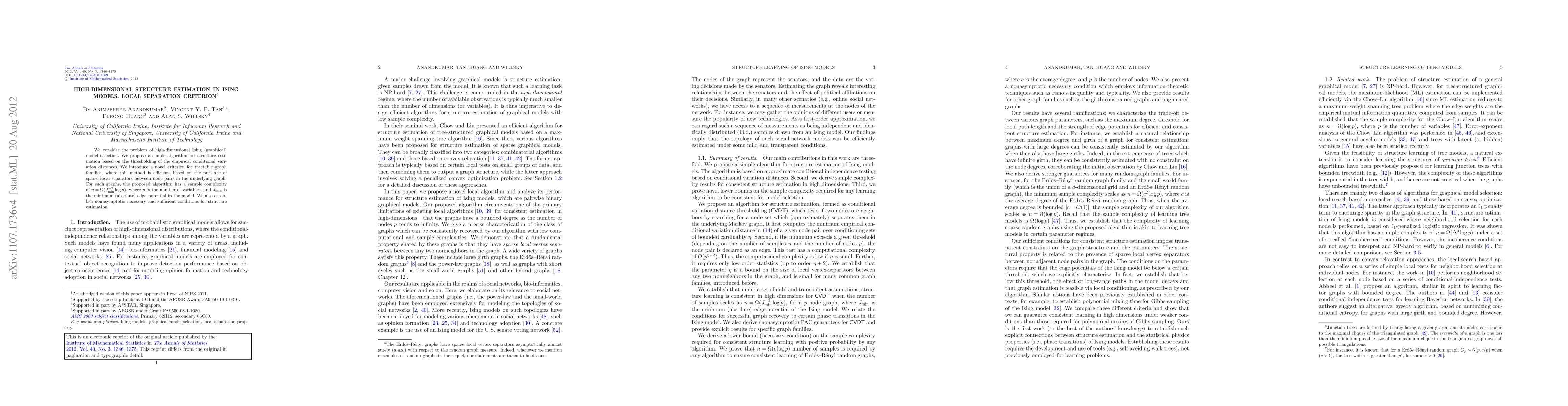 We consider the problem of high-dimensional Ising (graphical) model selection. We propose a simple algorithm for structure estimation based on the thresholding of the empirical conditional variation distances. We introduce a novel criterion for tractable graph families, where this method is efficient, based on the presence of sparse local separators between node pairs in the underlying graph. For such graphs, the proposed algorithm has a sample complexity of $n=\Omega(J_{\min}^{-2}\log p)$, where $p$ is the number of variables, and $J_{\min}$ is the minimum (absolute) edge potential in the model. We also establish nonasymptotic necessary and sufficient conditions for structure estimation.