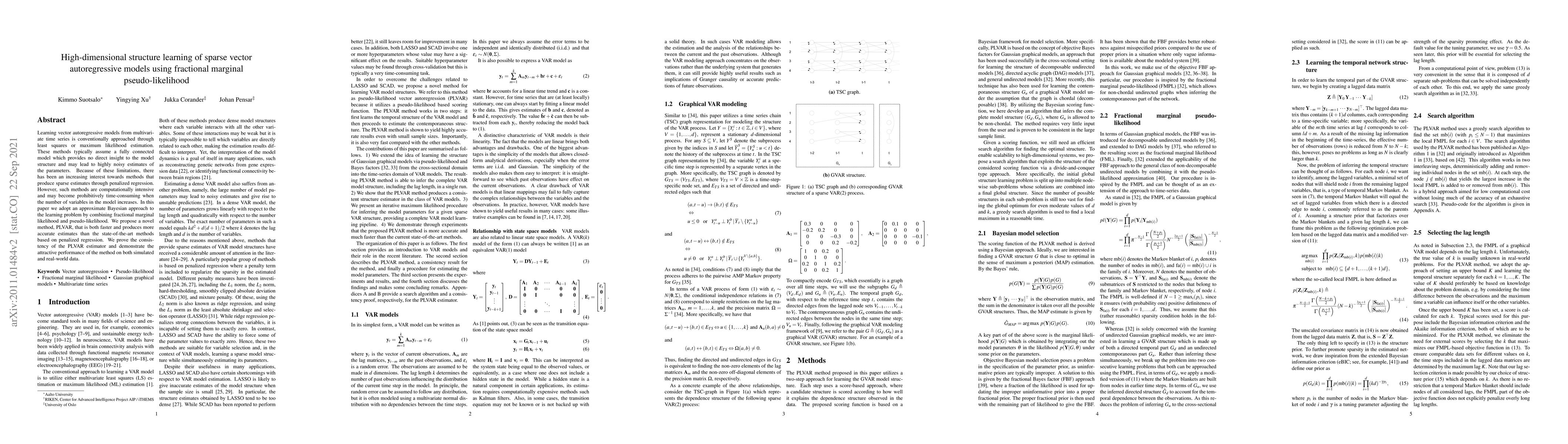 This paper proposes PLVAR, a novel method for learning sparse vector autoregressive models using fractional marginal pseudo-likelihood, which is faster and more accurate than existing penalized regression techniques. The method demonstrates consistency and superior performance on both simulated and real-world data.